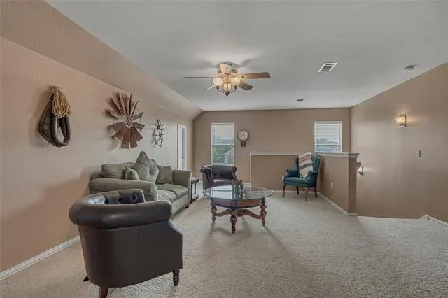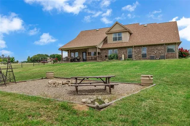 PRICE IMPROVEMENT! Charming, spacious, and functional home on 1.655 acres on a private development. This 4-bedroom, 3-bath property features two living areas and two dining spaces across two levels, designed for comfort and flexibility. The inviting main living area with fireplace flows seamlessly into an open kitchen with granite countertops and a generous pantry. Split bedrooms provide privacy, with a secluded primary suite for a peaceful retreat. Upstairs offers a second living area, bedroom, and bath—ideal for guests or multi-generational living. The large backyard includes pipe fencing with no-climb wire, four water hydrants, fruit trees, two storage sheds and a 220V garage outlet. One horse permitted. Community amenities include a pool. Updates include a water heater (2022), plus a storm shelter and exterior cameras for added peace of mind. Conveniently located to shopping and restaurants. Brock ISD.