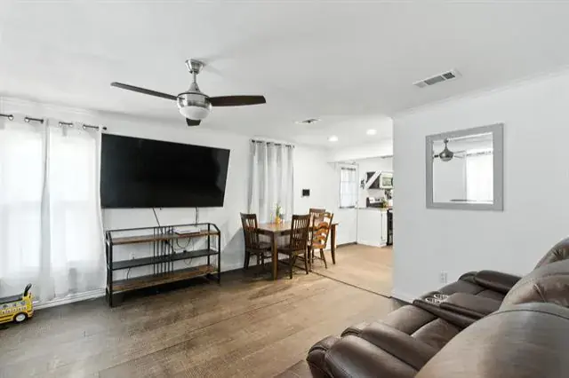 Interior features include a whole home security system, granite countertops, updated plumbing, energy efficient windows, and a 2022 HVAC system. The open concept layout offers a seamless flow from the living area into a bright kitchen with contemporary appliances and ample cabinetry.