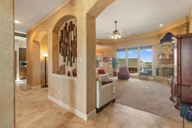 This custom single-story estate is designed for everyday comfort and entertaining with room to grow. The main home features 4 bedrooms, 3 baths, and a 3-car garage with a split-bedroom layout and timeless architectural details throughout. A stunning entry with custom iron and glass door and barrel ceiling sets the tone, leading into a spacious living area with fireplace and backyard views.