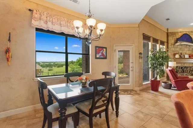 The kitchen is a true centerpiece with dramatic ceiling height, exposed beams, an oversized island, breakfast bar, built-in appliances, and an extended walk-in pantry with exceptional storage. Formal dining and breakfast areas provide flexibility for every gathering.