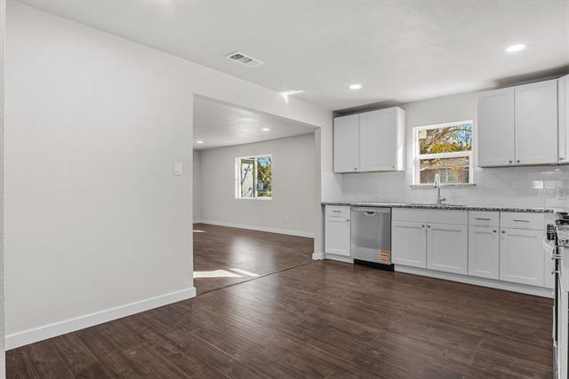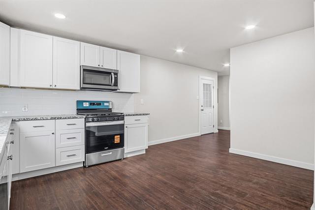 The open-concept living area flows seamlessly into a brand-new kitchen complete with granite countertops, new cabinetry and stainless steel appliances — perfect for entertaining or family gatherings. Both bathrooms have been completely remodeled with designer tile, new vanities, new shower, tubs and toilets.