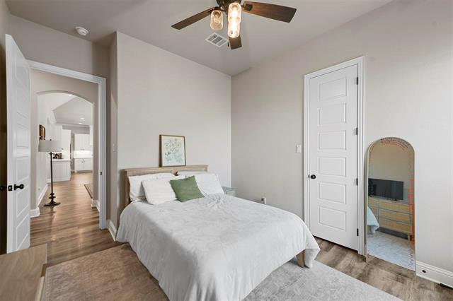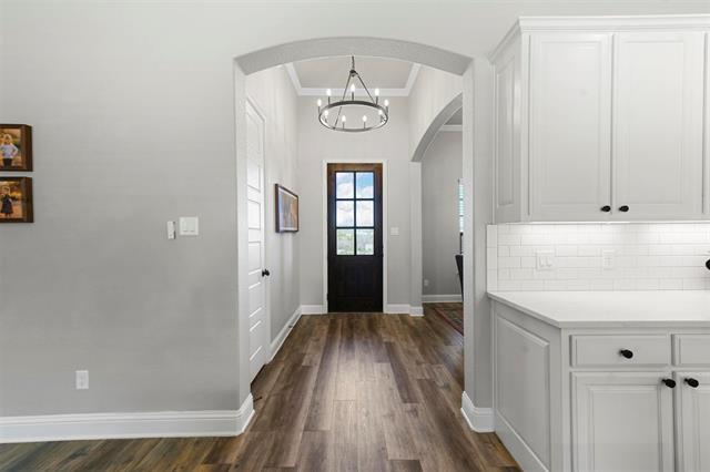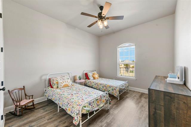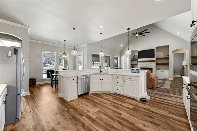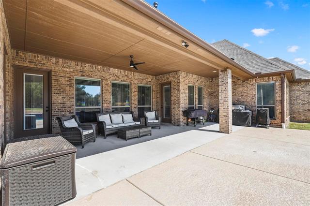Beautiful brick and stone home, perfectly situated high on an elevated lot with amazing sunsets and incredible long range views. Very well kept and showing as next to new, this wonderful home has a terrific open concept floor plan of hard surfaces throughout flowing seamlessly kitchen to living to dining, the perfect layout for living and entertaining! Large living room with a soaring cathedral ceiling with wood beams and a gas fireplace in stone, flanked by built in shelving gives a sense of immediate warmth and welcoming. Chef’s dream kitchen with gleaming stainless appliance suite, loads of cabinetry, miles of quartz counters, extended bar and eat in breakfast nook. A formal dining room elevates the dining experience. Primary bedroom with ensuite spa like bath of dual vanities, soaking tub and dual entry walk in shower. Large game or media room can also serve as an office area. Mud room area with built-in bench. The large covered back patio leads to the all season, heated pool in the fenced back yard. Owned propane tank serves gas cooktop, water heater, fireplace generator and pool heater. Whole home backup generator, tankless water heater, programmable irrigation system, full rain gutters and well with whole home water filtration and softener. Brock ISD. ** SPECIAL BELOW MARKET INTEREST RATE FINANCING OPTIONS AVAILABLE! EXISTING 3.125% VA LOAN IS POTENTIALLY ASSUMABLE FOR QUALIFYING VETERANS!