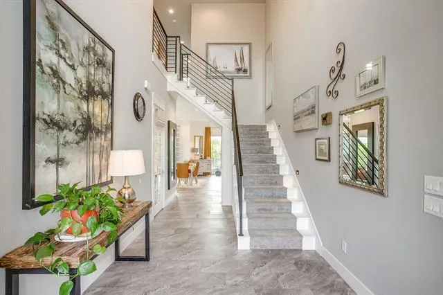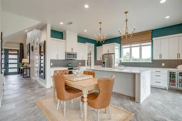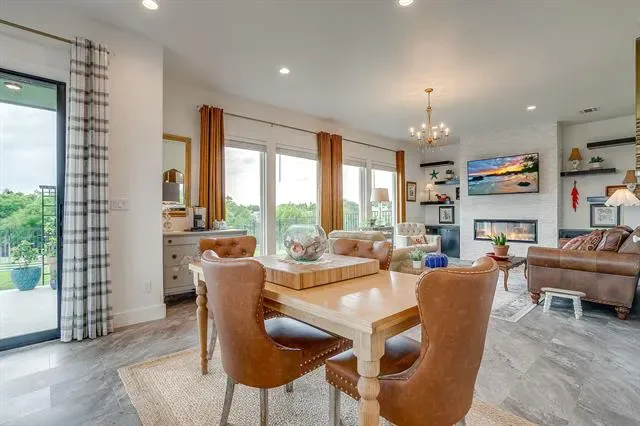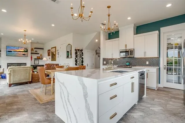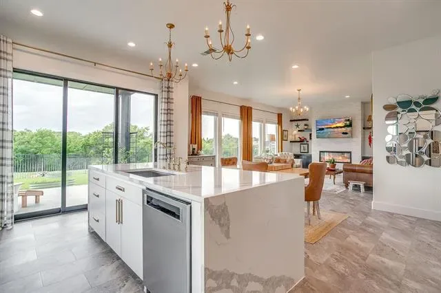 Built in 2021, this thoughtfully designed two-story home features an open-concept layout filled with natural light and elevated finishes throughout. The spacious living room is anchored by a sleek electric fireplace and flows seamlessly into the kitchen and dining area, ideal for everyday living and entertaining. The kitchen is a true centerpiece, featuring an oversized waterfall quartz island, walk-in pantry, abundant cabinetry, and expansive prep space. An accordion-style glass door off the kitchen opens to the covered patio, creating effortless indoor-outdoor living.