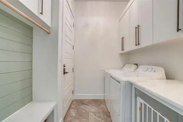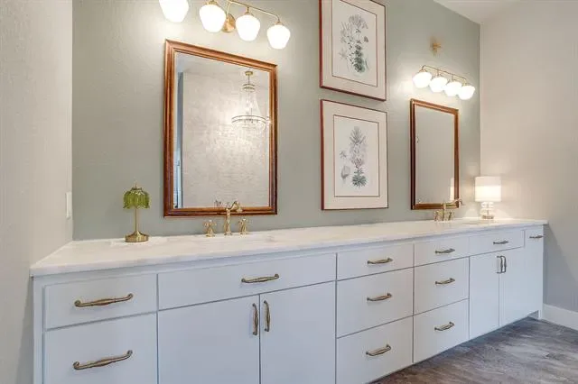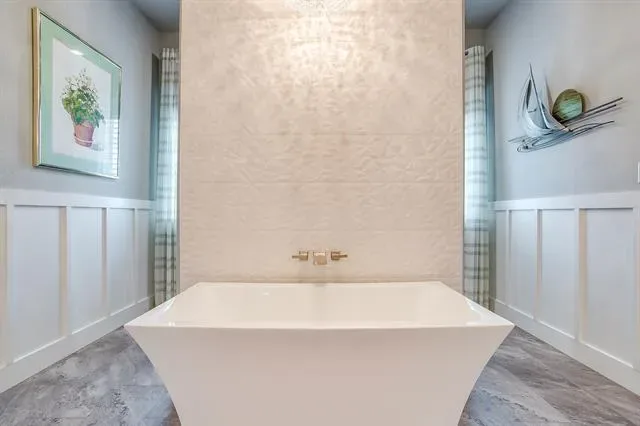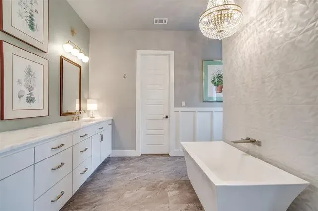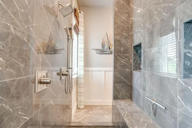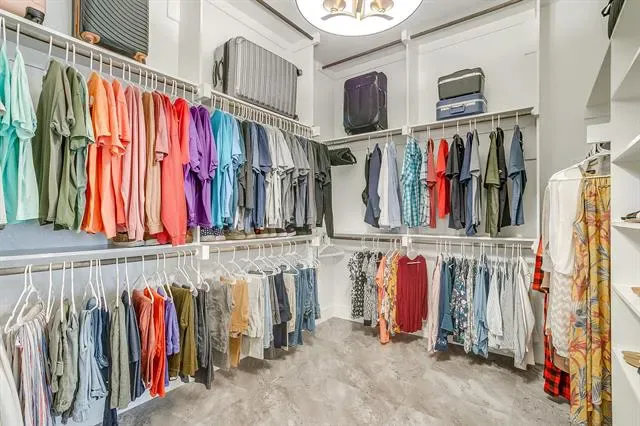 The primary suite is privately located on the first floor, offering a true retreat with marble countertops, dual vanities, a soaking garden tub, separate walk-in shower, and a custom closet system.
