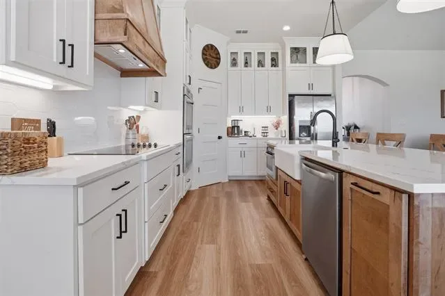 Inside, the home showcases a thoughtfully designed open floor plan highlighted by a vaulted living room ceiling and elegant fireplace, creating a welcoming space for both relaxation and entertaining. The kitchen is equally impressive, featuring dual ovens, ceiling-height cabinetry, abundant storage, and a walk-in pantry, blending functionality with style.