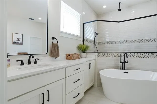 The primary suite offers a private retreat designed with comfort in mind. The bathroom features a split vanity arrangement, pebble-stone walk-in shower, and a deep garden soaking tub for spa-like relaxation. The primary closet is enhanced with built-ins and extended hanging storage to the ceiling, while each secondary bedroom also includes custom closet organization systems.