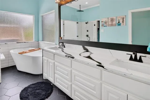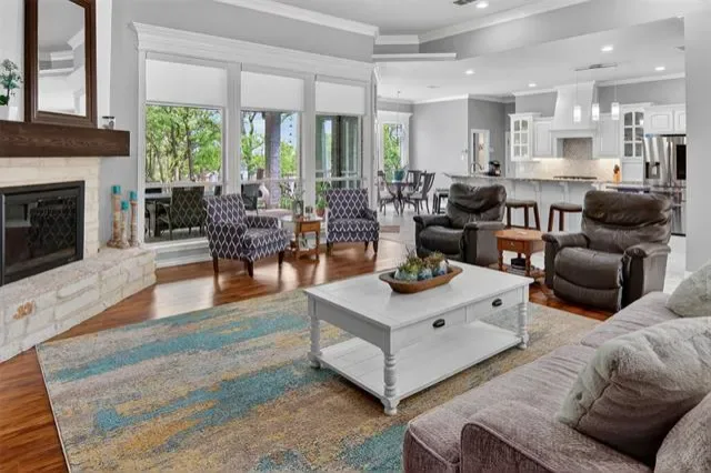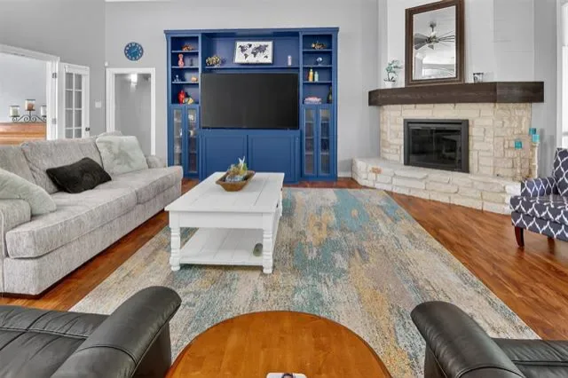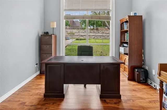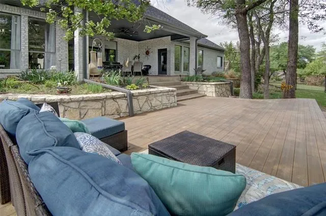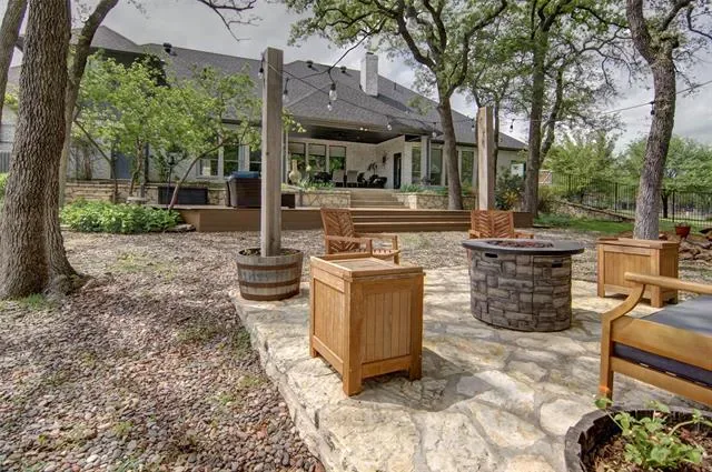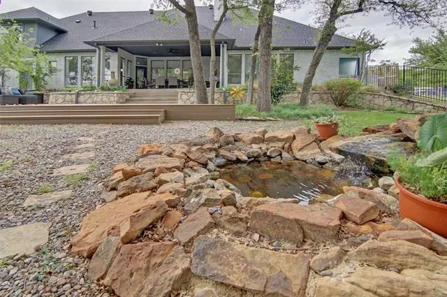 Welcome to this beautiful custom home on 1.6 acres in the lovely, desirable neighborhood of Forest Park. The open floor plan with soaring ceilings and a wall of windows overlooking a beautiful backyard welcomes you. Walk out onto the large covered patio and into the beautifully-landscaped backyard where you can relax to the sights and sounds of nature. A lovely rock water feature with a nearby deck and swimming pool with cabana and outdoor kitchen make for fun, relaxing days and evenings. The open kitchen area with granite counters, tile backsplash, large island, gas cooktop, double ovens, and walk-in pantry is perfect for entertaining. The handsome wood-burning, rock fireplace in the family room has a gas starter and can be converted to gas only with gas logs for convenience. The large primary suite includes an ensuite bath with free-standing tub, over-sized shower, dual sinks, and a walk-in closet with built-in chests. Three other bedrooms, 3 more full baths, a second dining area, an office, and a game room (which could be a 5th bedroom) complete the living space. The oversized 3-car garage contains a workbench and cabinets. A storm shelter and whole-home, natural gas generator on city gas provide safety and security during times of severe weather.