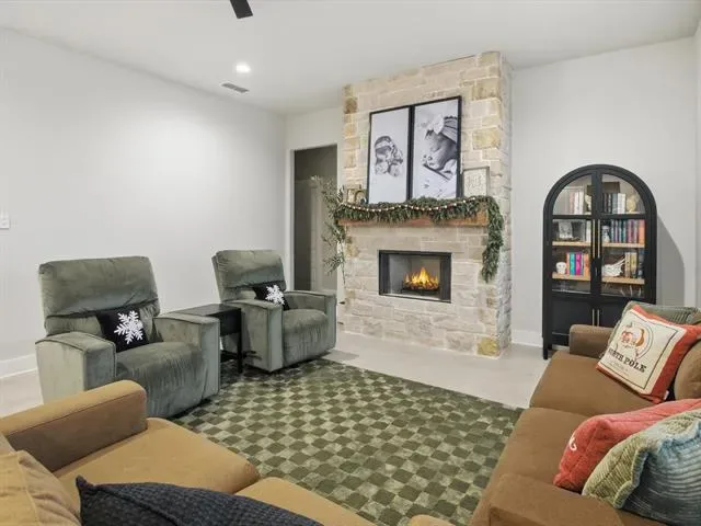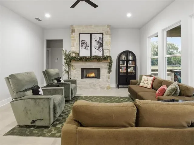 Inside, the home is thoughtfully designed with tall ceilings, abundant natural light, and warm, inviting finishes. A stone fireplace anchors the main living area, while the kitchen features a large island and open flow that works beautifully for both everyday living and hosting.