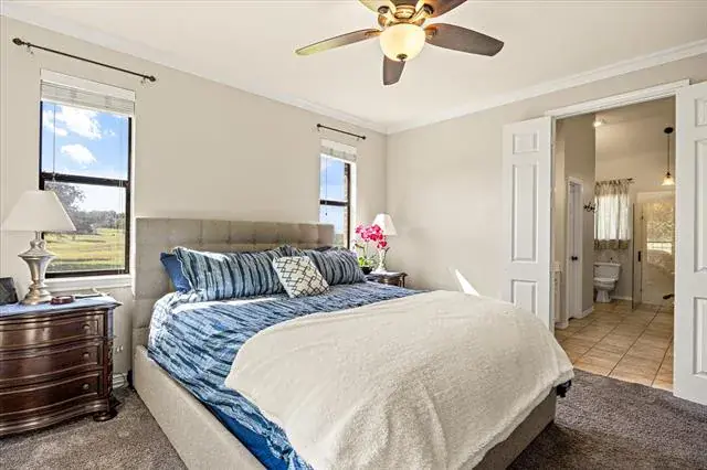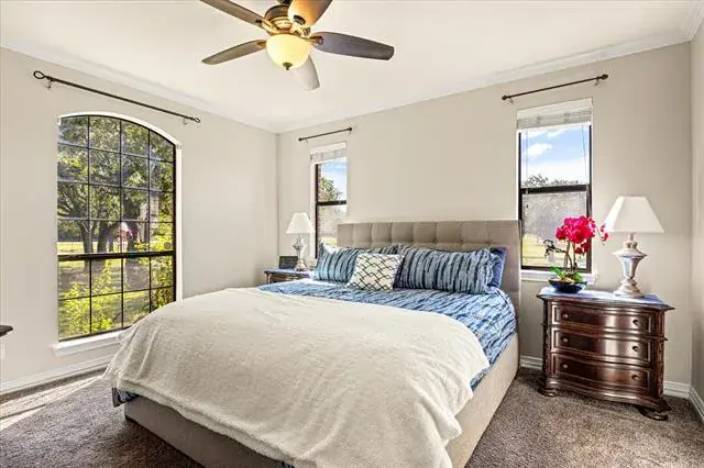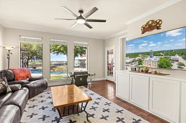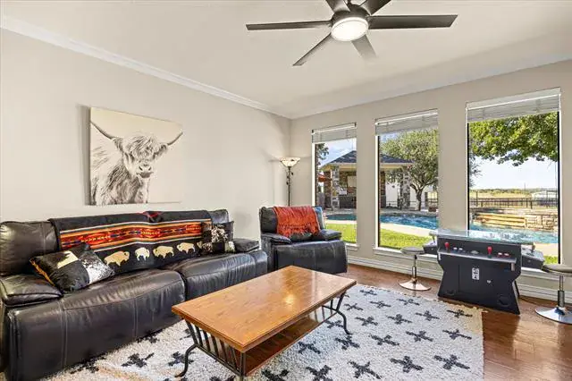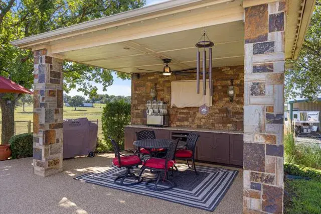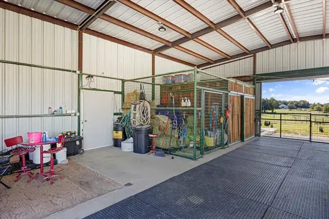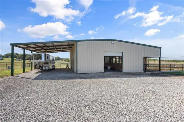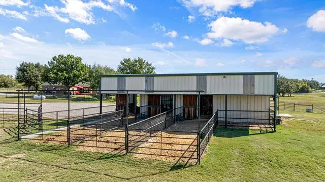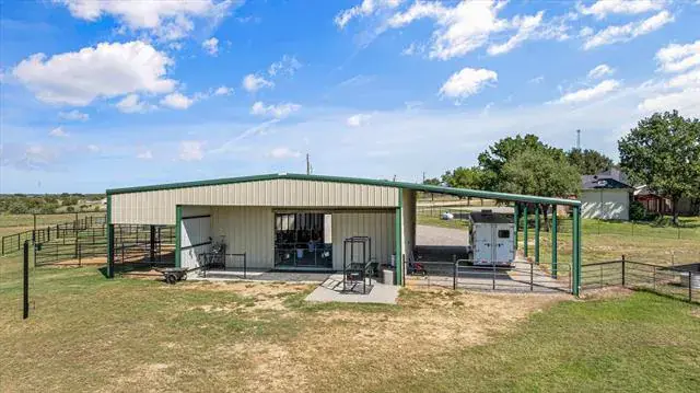 Welcome to 5444 Meadow Ridge Drive, an exceptional 9.98 ag-exempt acres horse property designed for both comfortable living and serious functionality. The land features mature trees, cross-fenced coastal pastures for horses or cattle, and a stocked pond with bass and catfish. The 4-bedroom, 3.5-bath home offers a split-bedroom layout with two living areas, open dining space, and a breakfast nook. The main living room features a stone fireplace, while the second living area overlooks the pool and is ideal for entertaining, game days, or a media room. The 4th bedroom also functions well as a home office. Recent updates include fresh interior paint, new appliances, updated HVAC, and a whole-house attic fan. Outdoor living is built for Texas entertaining with a PebbleTec saltwater pool and spa, LED lighting, rubber-coated decking, and a cabana equipped with a TV and Bluetooth speakers. A fire pit area creates the perfect gathering space under wide-open skies. Equestrian improvements include a 36×50 barn with three 12×12 stalls, 12×30 covered runs, tack room, wash area with Priefert stocks, turbo fans, and a fly spray system. Attached 24-foot covered parking includes a 50-amp RV plug. A 20×30 workshop with lean-tos offers additional covered parking and another 50-amp RV hookup. An additional 20×25 covered area provides ideal space for equipment or trailers. Working facilities include cattle pens, squeeze chute, a 150×180 panel arena, and a 50-foot round pen. Three electric gates provide controlled access to the home, barn, and pastures. Conveniently located just 10 minutes from Weatherford, 15 minutes to Teskey’s, and 45 minutes to Fort Worth, this property offers usable acreage, functional horse improvements, and a move-in-ready home in a highly desirable location.