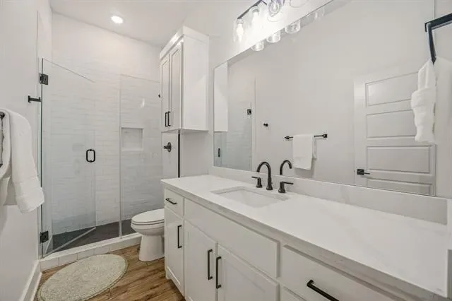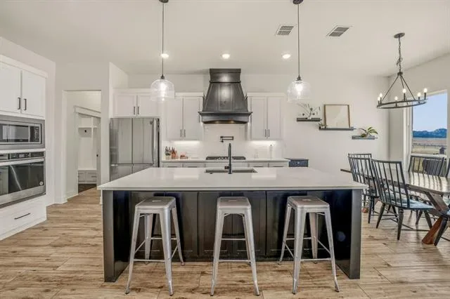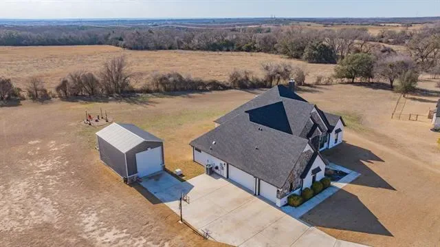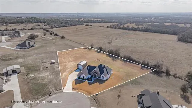 Welcome to 435 Creekside Court a thoughtfully designed home built in 2021 that blends modern finishes, quality construction, and peaceful privacy on 2 acres. This spacious 4-bedroom, 3-bathroom residence offers 2,801 square feet of well-planned living space, including a dedicated office and a bonus room, providing flexibility for work, play, or additional living needs. The heart of the home is the stunning kitchen, designed to be both beautiful and highly functional. It features crisp white cabinetry paired with a striking black accent island, elegant white marble countertops, and abundant storage that makes organization effortless. Large windows flood the space with natural light, creating a bright and inviting atmosphere that flows seamlessly into the main living and dining areas—perfect for everyday living and entertaining alike. Throughout the home, you’ll find tile flooring, elevated details such as built-in dressers in the closets, and thoughtfully selected finishes. The primary suite serves as a true retreat, highlighted by a huge bathroom with a large walk-in shower and plenty of space to relax. The oversized laundry room adds exceptional convenience with a sink, generous cabinetry, and a built-in mud bench. Step outside to enjoy the privacy and versatility this property offers. The 3-car garage includes a third bay large enough for a full-size pickup, and the 20×30 ft. shop with electricity is ideal for hobbies, storage, or projects. Evenings can be spent around the fire pit or on the large back porch, overlooking an open field that creates a peaceful, private backdrop. Additional features include trim lights on the front of the house, a private well, water softener, two water heaters, high speed internet, and full spray foam insulation, contributing to efficiency, comfort, and long-term value. This home offers the perfect balance of modern style, functional space, and country serenity—just 15 minutes outside of Weatherford.