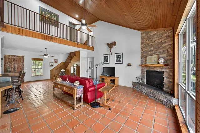 Set on 1.068 wooded acres in Parker County, this 3-bedroom, 3-bath home offers 3,490 square feet, a flexible two-story layout, &' distinctive Southwest charm throughout. The approach begins with a wide covered front porch, stone columns, &' a metal roof, while inside the home opens to warm natural textures, terracotta-style tile, rustic wood finishes, &' inviting living spaces designed for both daily comfort &' entertaining. The main living room features a vaulted wood ceiling, expansive rear windows, &' stone gas fireplace. The kitchen is positioned for gathering with a large peninsula, abundant wood cabinetry, stone counters, SS appliances &' easy flow to the breakfast area, dining room, &' main living space.