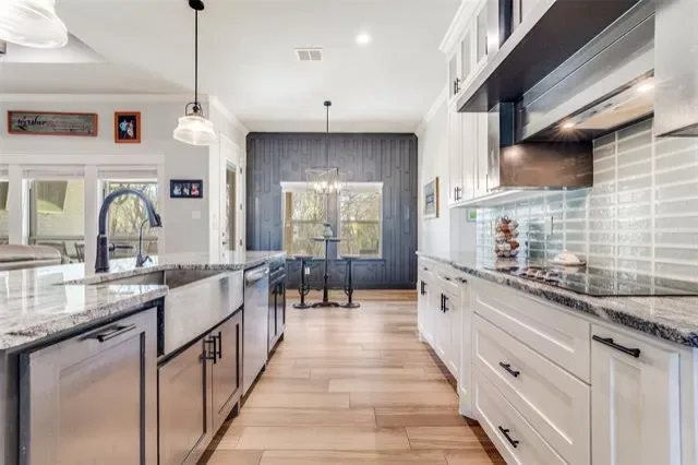 The main living area serves as the heart of the home with a floor to ceiling stone fireplace and exposed wood beams that create a warm and inviting atmosphere. The kitchen is well equipped with a large island, granite countertops, abundant cabinetry, farmhouse sink, electric cooktop, and a bright breakfast nook. Additional upgrades include a reverse osmosis system at the kitchen sink, whole house water softener, and a two stage sediment filtration system.