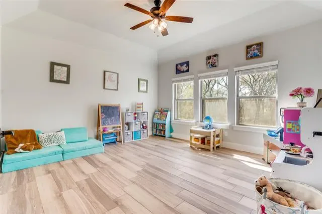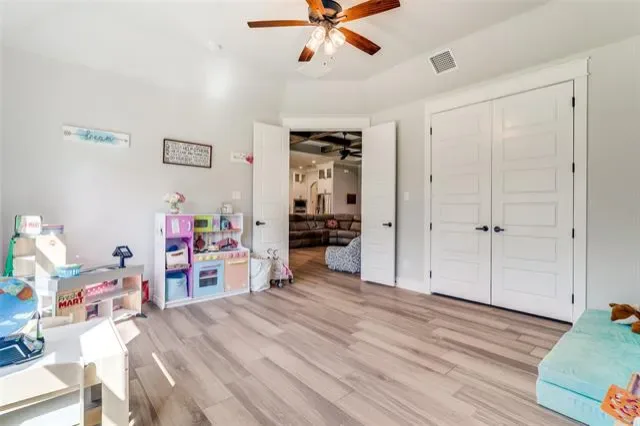The primary suite provides a comfortable retreat with dual vanities, a soaking tub, separate shower, and an oversized walk in closet with extended storage. The home offers four bedrooms and two and a half baths, along with a versatile game room that includes a closet and built in shelving, allowing for use as a fifth bedroom if desired. A flex space near the entry can function as a dining area, office, or additional living space.