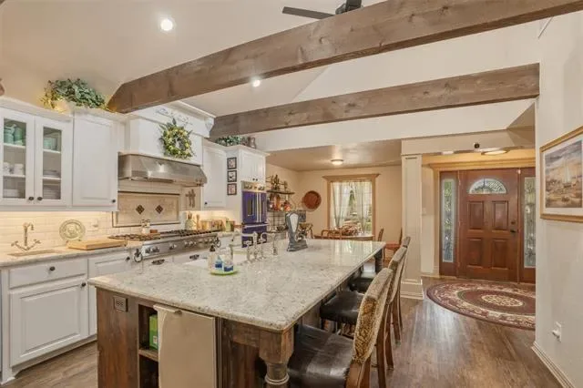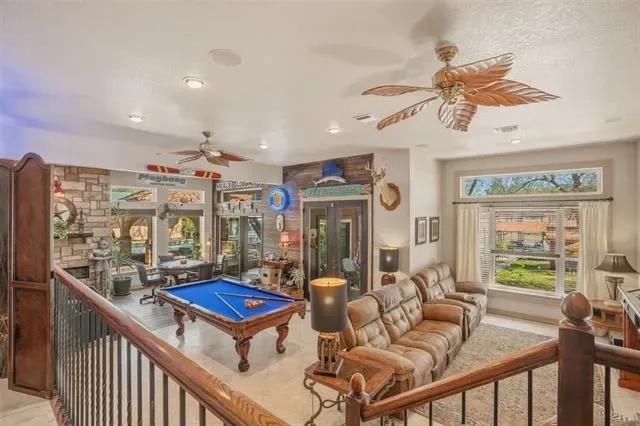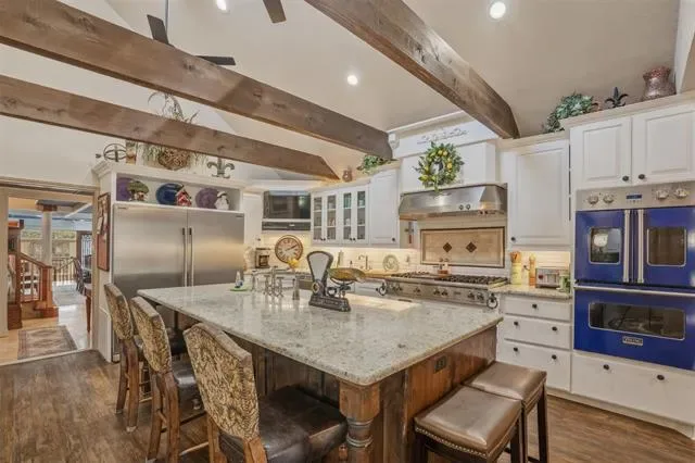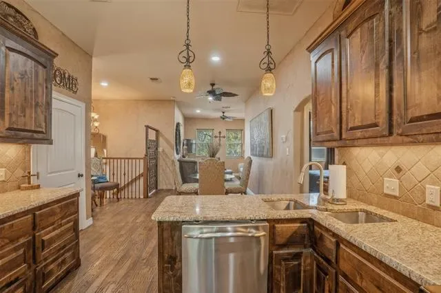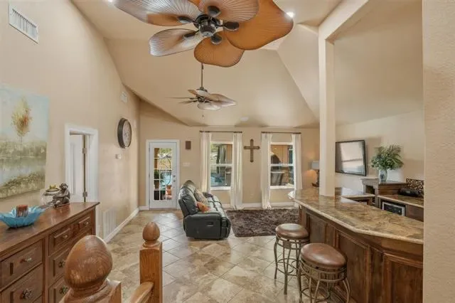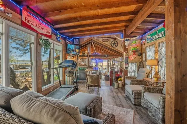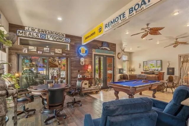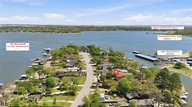 Rare Lakefront Estate! Dual Homes on Lake Weatherford! Ultimate Entertainer’s Paradise! This exceptional waterfront estate features two homes on adjoining lots with unmatched amenities, offering the perfect blend of luxury living and resort-style entertaining. The impressive 4,470 sq ft main residence showcases 4 bedrooms and 3.5 bathrooms, designed for both comfort and entertaining on a grand scale. Expansive living spaces include a large Living Game room with stone fireplace, a heated and cooled outdoor kitchen and sunroom that serves as a 2nd living area filled with natural light. The chef’s kitchen is a standout, equipped with a Viking gas cooktop and double oven, dual sinks, two dishwashers, icemaker, oversized island, commercial-grade vent hood, and walk-in pantry. The private study offers custom wood built-ins. Two luxurious primary suites provide flexible living options—both with sitting areas and ensuite baths. Upstairs suite features a separate jetted tub and shower, while downstairs suite includes a spacious walk-in shower and linen storage. Step outside to your private resort: a sparkling in-ground pool &' spa, cabana, expansive outdoor living spaces, and private docks with covered boat lift. The fully fenced property includes 2 electric gates, a circle driveway, 4-car covered parking, additional boat parking, and a private boat ramp. The 1,968 sq ft secondary home offers 2 bedrooms, 2 bathrooms with high-end finishes throughout. The kitchen features GE Profile appliances, custom wood cabinetry, and opens to beautifully finished living and dining spaces with hand-scraped hardwood floors. The downstairs area includes ceramic tile flooring and an entertainer’s bar complete with granite countertops, wine fridge, mini fridge, sink, and microwave. This one-of-a-kind resort-style lakefront compound offers endless possibilities for multi-generational living, guest accommodations, or income potential—all in a stunning waterfront setting.