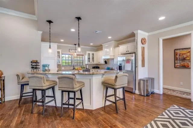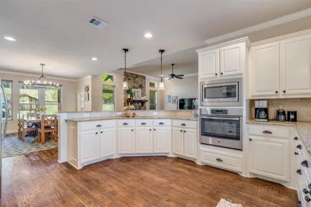 Beautiful custom home in Lakeway Estates with an ideal layout for family living and entertaining. Features include hand-scraped floors, plantation shutters, designer lighting, and a floor-to-ceiling stone wood-burning fireplace. Open concept living, dining, and kitchen offer great flow and functionality.