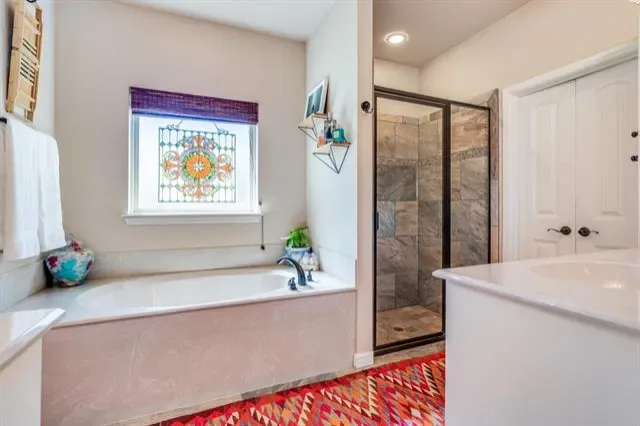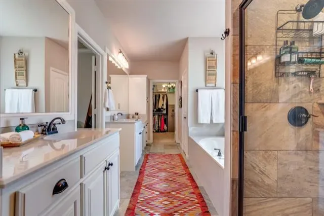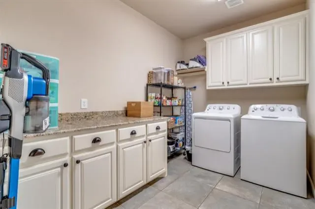 Kitchen includes stainless GE appliances, granite countertops, and custom glass-front cabinetry. Split-bedroom design with spacious primary suite featuring dual vanities, walk-in closets, tiled shower, and garden tub. Two secondary bedrooms plus a flexible office or playroom. Oversized laundry room with granite folding counter and ample storage.