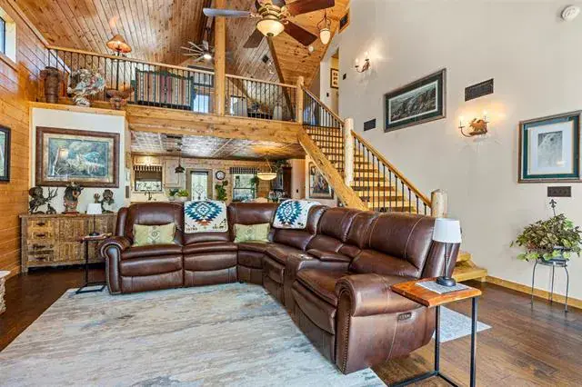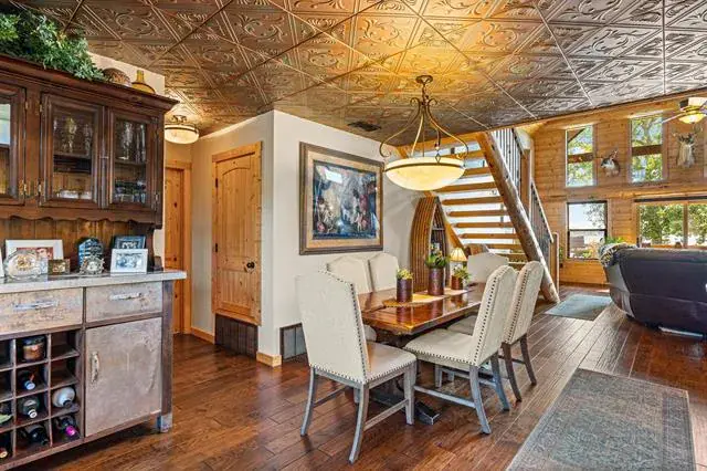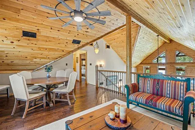 Step inside to discover soaring vaulted ceilings and natural pine interior walls that create a warm and cozy atmosphere. A wood burning fireplace and a striking set of oversized log stairs that lead to the upper-level living area, providing both functionality and character. With two distinct living spaces, this home is ideal for hosting family, entertaining guests or just quite evenings at home.