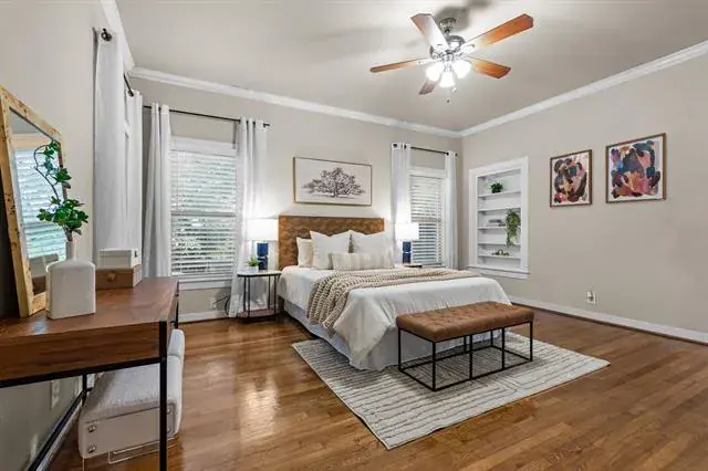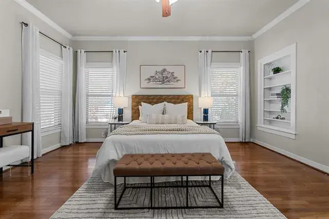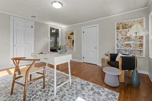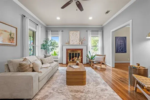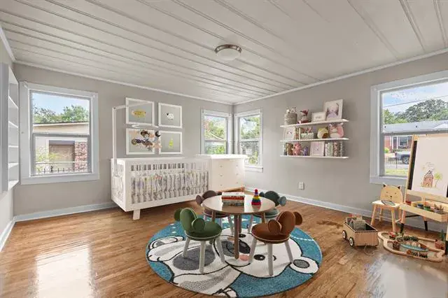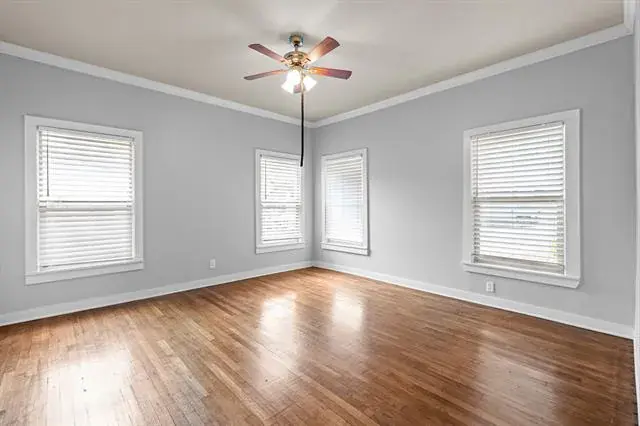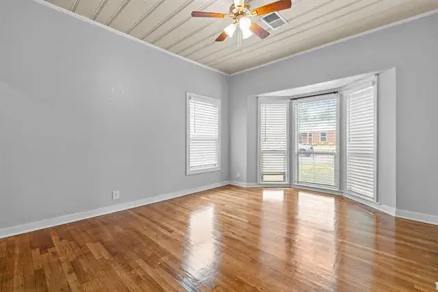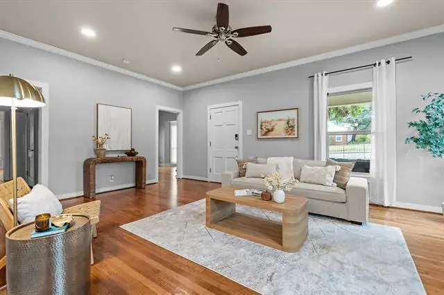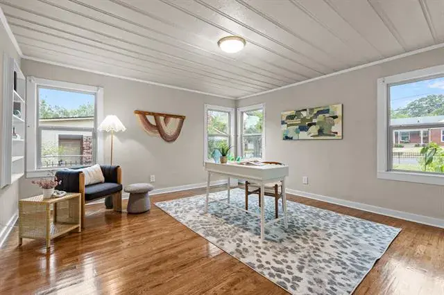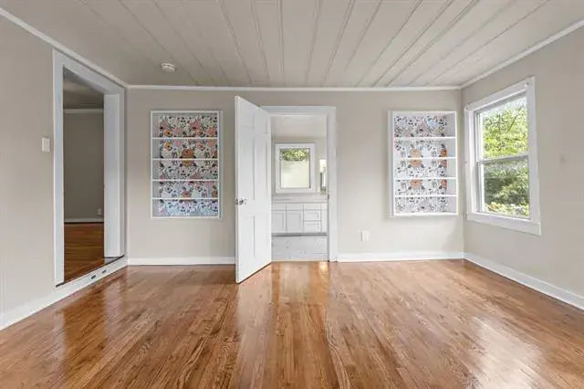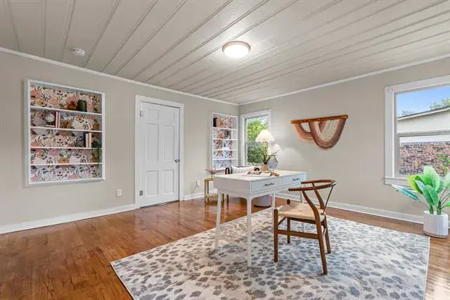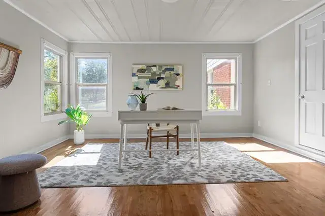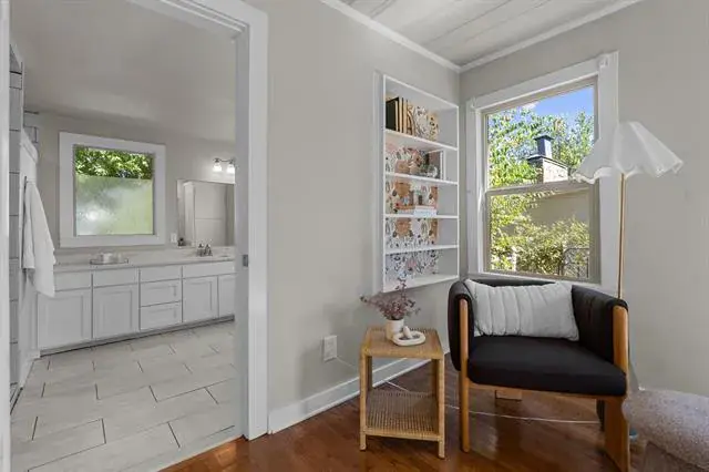 Step in and immediately feel at home with this homes tall ceilings, hardwood floors and easy flow floorplan. Hardwood floors throughout living, dining, bedroom and bonus room located off the primary bedroom. The primary bedroom is private and includes the bonus room that is big enough for multiple options. Exercise room, nursery, office, etc. Primary Bathroom was remodeled in 2020 and is very spacious. Windows were replaced for energy efficiency and function in 2020. New HVAC installed in 2020. New roof in 2025 and new kitchen floors in 2025. The garage is also larger and features full bathroom, washer and dryer hookups and fully insulated garage door.