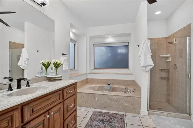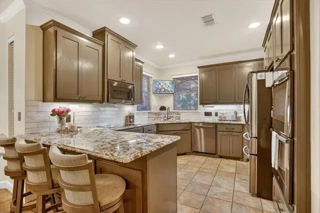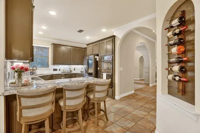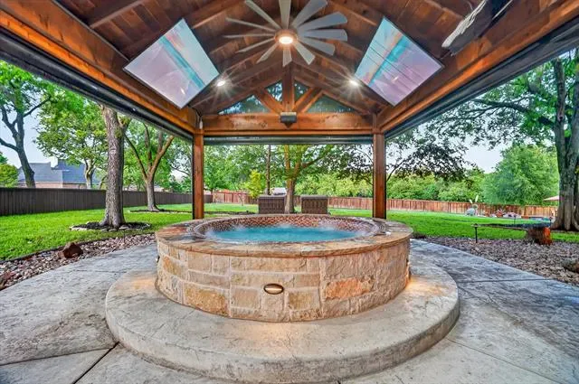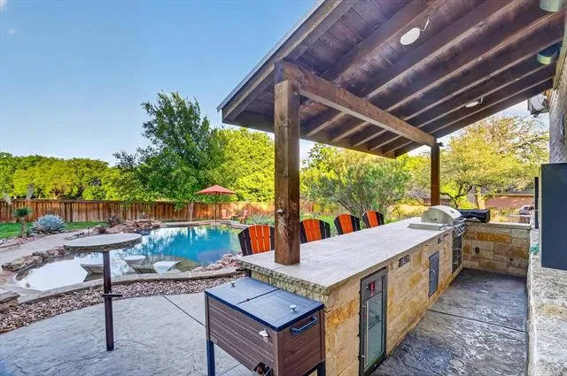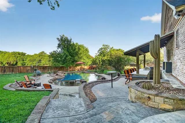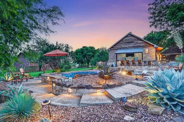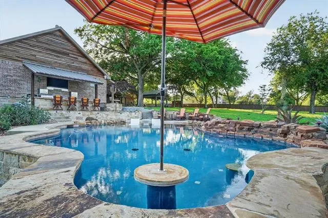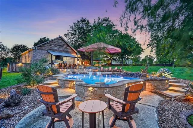 Welcome to 152 North Star Crossing where luxury, comfort, and functionality come together on nearly an acre and a half of beautifully designed space. This stunning 4-bedroom, 3-bathroom home also features a dedicated pool bath, making it perfectly suited for both everyday living and entertaining. Step outside and experience a true resort-style backyard oasis. The heated and cooled lounge pool invites year-round enjoyment, while the custom hot tub space, surrounded by sleek electric shades, offers a private retreat to unwind. Gather around the fire pit on cool Texas evenings or host unforgettable get-togethers in the fully equipped outdoor kitchen, complete with a built-in grill and refrigerator.