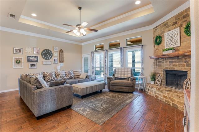 From the barrel-ceiling entry accented with crown molding to the stone fireplace and trayed ceiling in the living room, every detail feels considered. The kitchen flows easily into the living and dining spaces, ideal for connection and everyday ease.