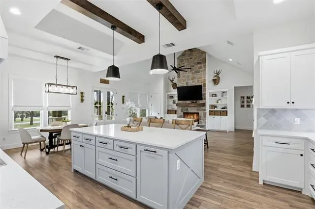 Built-in Features, Cathedral Ceiling(s), Decorative Lighting, Double Vanity, Eat-in Kitchen, Kitchen Island, Open Floorplan, Paneling, Pantry, Walk- In Closet(s)