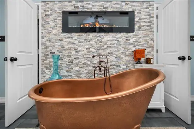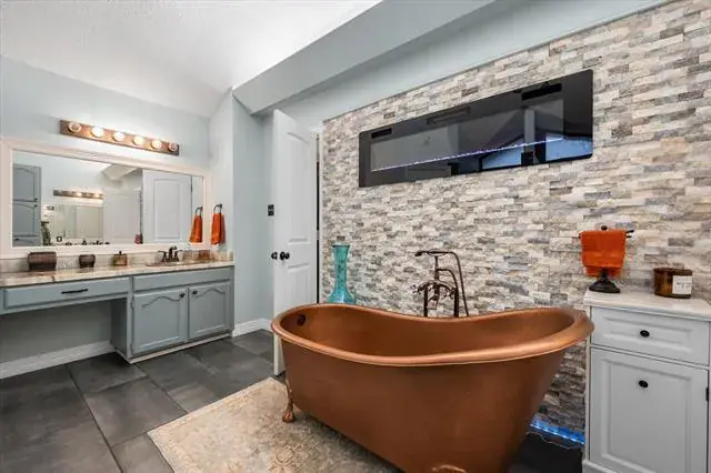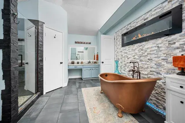Nestled on 1.5 acres of picturesque land, this stunning 3-bedroom, 2-bath home offers a perfect blend of comfort and charm. A hidden office and a bonus gym room—both not included in the tax square footage—provide extra space for work and wellness. The primary suite is a true retreat, featuring a cozy fireplace by the bed and a luxurious en-suite bath with gorgeous copper sinks, a copper soaking tub, and a fireplace for ultimate relaxation. A walk-in shower adds to the spa-like experience.