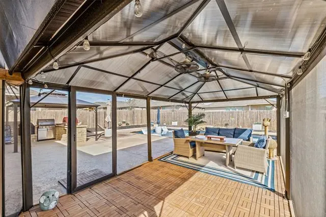 IMPROVED PRICE!!! NOT YOUR AVERAGE NEW BUILD! Purchased new in 2023 as a standard builder-grade home, and completely transformed into a custom-designed showpiece with over $160,000 in high-end improvements! This home doesn’t blend in with the neighborhood — it redefines it! The kitchen is the heart of the home – a dramatic counter-to-ceiling custom backsplash sets the tone, paired with warm butcher block countertops and a timeless farmhouse sink. Additional cabinetry was added to create a seamless built-in look around the refrigerator, while a butler pantry enhances both storage and function. Sliding drawers have been installed throughout the cabinetry for convenience and clean organization, and glass-front cabinet panels for a high-end finish. The Master bath has been completely reimagined into a spa-inspired escape featuring a sunken jacuzzi tub, converted walk-in shower, Tuscan inspired tile, upgraded fixtures, custom shiplap detailing, and beautifully crafted shelving. The bedroom continues the elevated feel with custom trim and striking accent wall. The main living areas are flooded with natural light thanks to near wall-to-wall Marvin windows and an impressive 8-foot double sliding glass door that seamlessly connects indoor and outdoor living. And then there’s the backyard — your private resort! Custom pool and concrete work, plus gazebo and fully equipped outdoor kitchen. Enhanced landscaping and a new upgrade pool pump and filter complete an outdoor living experience designed for entertaining, relaxing, and enjoying every season. If you’ve toured other homes in the neighborhood and felt like they looked the same, this is the one that proves they don’t have to!