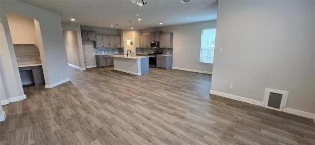 Inside, the layout is straightforward and functional. The main living area is open and anchored by a large kitchen with a center island, plenty of counter space, and a direct line of sight into the dining and living areas. It’s set up for everyday use and casual entertaining without feeling tight.