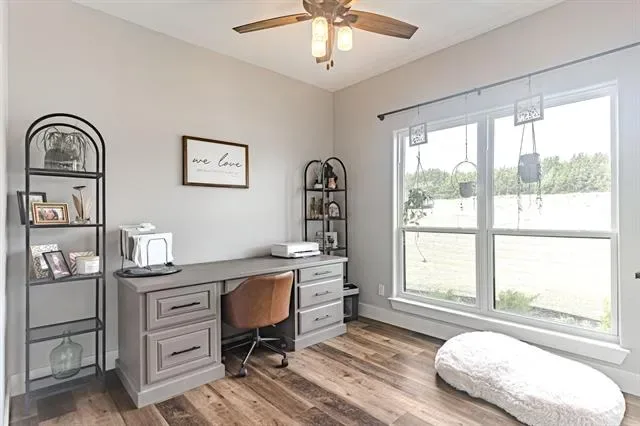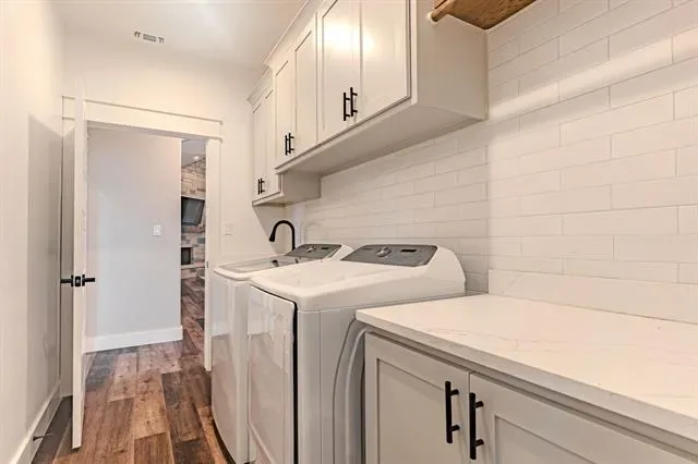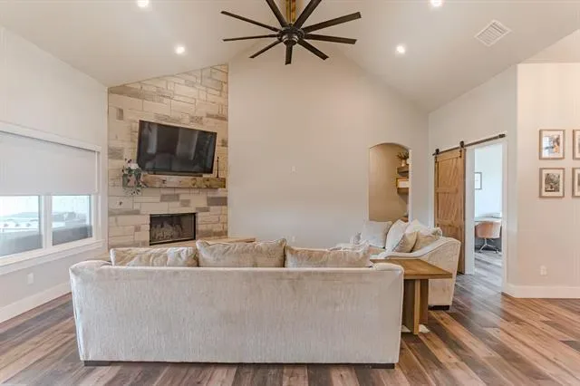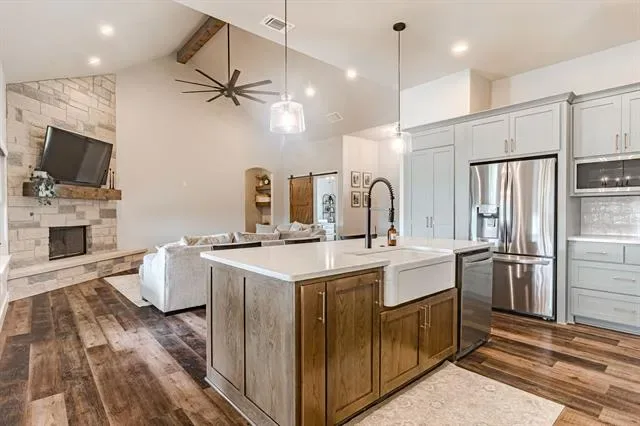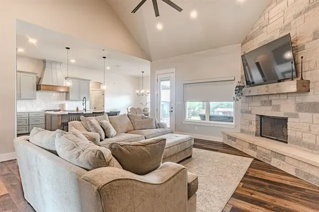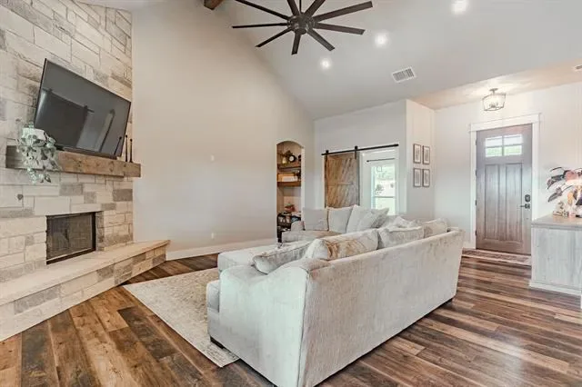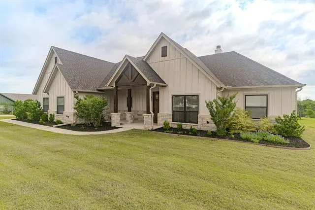 Welcome to this beautiful custom home situated on two acres in highly sought-after Peaster ISD, including a 30×40 shop with a 20×30 lean-to for additional coverage or carport. Built in 2022 by Circle M Homes, this thoughtfully designed property combines modern finishes with functional living spaces—perfect for both everyday life and entertaining. The home features four spacious bedrooms, with one easily adaptable as a private office, along with two full bathrooms and a convenient half bath. The open-concept living and dining area is anchored by a stunning floor-to-ceiling stone, wood-burning fireplace, creating a warm and inviting atmosphere. The kitchen is designed for both style and efficiency, offering quartz countertops, a large walk-in pantry, and seamless flow into the main living space. The primary suite is a true retreat, complete with a freestanding soaking tub, an oversized walk-in closet with built-in cabinetry, and direct access to the laundry room through the primary closet and mudroom for added convenience. Additional highlights include quartz countertops, luxury vinyl plank flooring for easy up-keep, built-in mudroom lockers, a stylish tile backsplash in the laundry room, water softener system, and an oversized 26’ x 25’ garage. Step outside to enjoy the expansive covered back patio—perfect for hosting gatherings or relaxing with family. The large fenced backyard provides plenty of space for outdoor living, pets, or play. For those needing extra workspace or storage, the property also includes a 30’ x 40’ shop with a 30’ x 20’ lean-to, offering endless possibilities. Located 7 min from Peaster schools, 11 minutes to Weatherford, 20 minutes to Costco, and 50 minutes to Fort Worth! This property truly has it all—space, style, and functionality in a peaceful and private setting.
