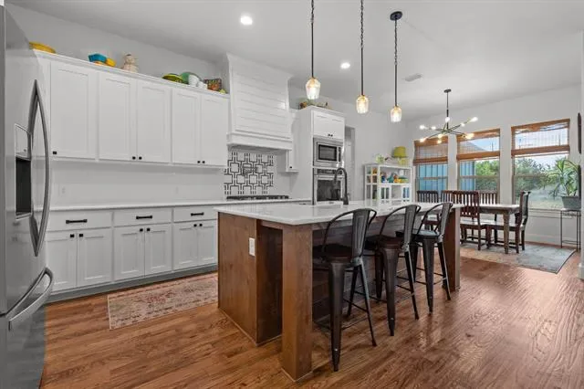 Inside, you’ll find an open-concept layout featuring rich hardwood floors, custom cabinetry, and thoughtfully selected finishes throughout. The heart of the home is the expansive kitchen, complete with a large island, double ovens, and ample storage—ideal for hosting gatherings or enjoying family meals.