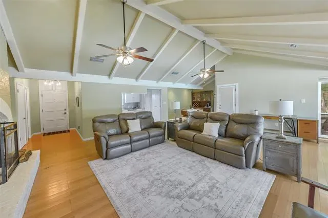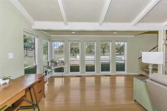 Inside, expansive windows flood the home with natural light, highlighting the warm character and architectural charm throughout. Enjoy cozy evenings with fireplaces in both the living room and the primary suite. The living space is enhanced by beautiful beam-vaulted ceilings, creating an open and inviting atmosphere.