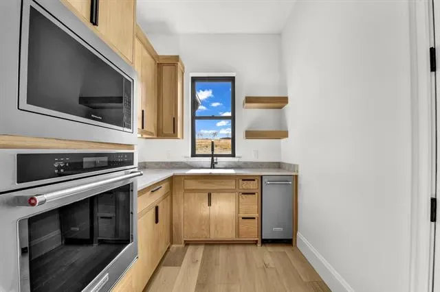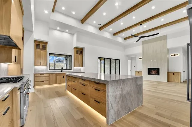 Set on a 2.35-ac lot within Brock ISD’s premier gated community, this residence blends sophistication and serenity. Through custom steel double doors framed by modern vertical pillar lights, guests enter a showstopping foyer. The formal dining room stuns with wainscoting, while the executive office features built-ins and French doors for refined functionality. At the heart of the home, a chef-inspired kitchen designed for entertaining impresses with a Taj Mahal quartzite waterfall island, counters &' backsplash, white oak inset cabinetry with black hardware, and commercial-grade appliances. A secondary prep kitchen with oven, microwave, sink &' patio access ensures effortless hosting. The great room, anchored by a floating fireplace, features contemporary fixtures and pillar lighting that infuse a warm, modern glow throughout. Engineered white oak flooring flows through the main living areas beneath 16-ft ceilings, adding natural warmth to the home’s sleek design. Expansive glass sliders open to a cathedral-style covered patio with stained tongue-and-groove ceiling—ideal for evening gatherings under Texas skies. The primary suite delivers spa-like tranquility with a circular soaking tub, glass-enclosed rainfall shower, dual vanities, and two oversized walk-in closets. A private sit-down vanity connects gracefully within the suite, blending beauty and function. Three additional bedrooms each offer ensuite baths and walk-in closets. Behind the kitchen, a staircase leads to a private loft with full bath, closet &' attic access—perfect for a gym, media room, or creative retreat. Outdoors, enjoy xeriscape landscaping with natural boulders, a buried propane tank, private well, aerobic septic, and the rare freedom to keep horses or chickens. M2 Luxury Homes once again delivers a residence that defines elevated living and modern Texas luxury.