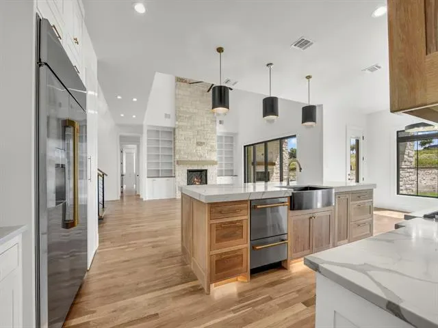 Welcome to 3,341 sq ft of pure sophistication in one of Brock ISD’s most prestigious neighborhoods, Santana Ridge Estates. This stunning 2-story home was crafted with every detail in mind. Enter through steel-framed glass double doors into a grand foyer that sets the tone for what awaits. The open-concept great room is anchored by a 22-foot ceiling and a dramatic floor-to-ceiling stone gas fireplace with floating mantle. Just beyond, a covered patio with wood-burning fireplace offers the perfect retreat for year-round entertaining. The chef-inspired kitchen is a showpiece, boasting quartz countertops with a waterfall backsplash, bold 2.5-inch drop-edge island, GE Café appliances, 48-inch dual-fuel commercial-grade range, built-in oven &' microwave, hidden walk-in pantry &' champagne bronze accents. Oak hardwoods flow through main living areas, while the mudroom &' laundry add warmth with brick flooring &' custom built-ins. The primary suite features a spa-like bath with dual shower heads, soaking tub &' designer finishes. Two main-level flex rooms add convenience as an office, sunroom or play space. A floating steel-beam staircase with white oak treads &' cable railings leads to the upper level, where an expansive loft &' catwalk overlook the great room. Upstairs offers a 2nd primary suite, 2 bedrooms joined by a Jack &' Jill bath &' an added laundry space. A large 2-car garage plus a drive-through single-bay shop with portico provide unmatched versatility. Added features include black-framed windows, tankless water heater, 250-gallon buried propane tank, private well, aerobic septic, ATT fiber &' buried utilities. Located just 10 minutes south of Weatherford in Brock ISD, this home embodies the pinnacle of luxury living—where design, comfort &' craftsmanship meet the moment you step inside. Call us today to make this home yours!