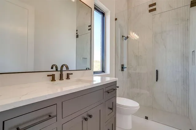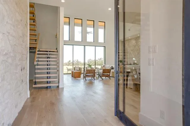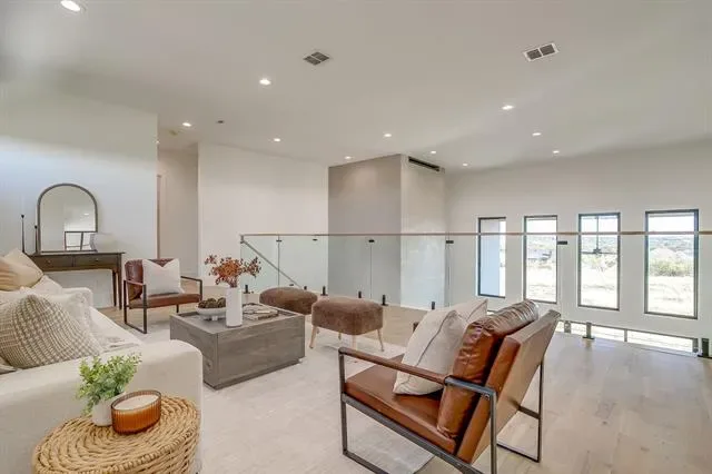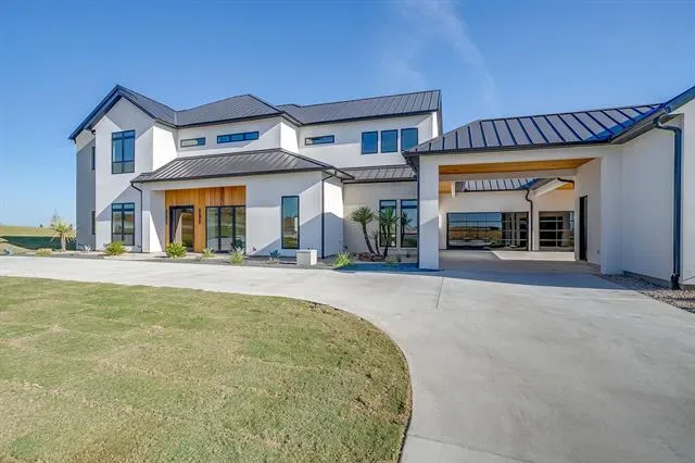 PREPARE TO BE CAPTIVATED! This high class architectural standout is the definition of bold, refined luxury and exceptional sophistication! Nestled in the sought-after Santorini gated community, you will find this one-of-a-kind home ready to dominate the first impression. As you drive through the Porte-Cochere–style design and half circle driveway, you will walk through a striking 6×8 metal and glass pivot door. Instantly welcome by a warm stone accent wall which opens to an airy, open-concept layout where a glass staircase ascends to a loft overlooking the living area. What a spectacular living room here with floor to ceiling Venetian-plastered fireplace and 24 foot ceilings with a full custom bar with additional sink and accent stone wall. The slated design kitchen is equipped with Taj Mahal countertops with a dropped edge finish, top of the line built-in SKS appliances, custom cabinetry including spice rack and utensils drawers, pot filler above gas cooktop, under cabinet lighting and an unbelievable pantry with custom wine bar. The dreamy primary suite offers an unbelievable cascading waterfall shower in what feels like a five-star resort style spa with 12 foot seamless glass walls. Each bedroom offers its own ensuite bath and impressively spacious closets, while the upper level features a flexible living space and a game room equipped with its own bar—perfect for entertaining. Home office with built-in''s and laundry room with dog wash. Enjoy beautiful wide-open views off the back patio with a glass of wine and cozy up to the wood-burning fireplace. This truly is a stunning design, packed with every luxury feature and is ready for YOU to call this place home for good!