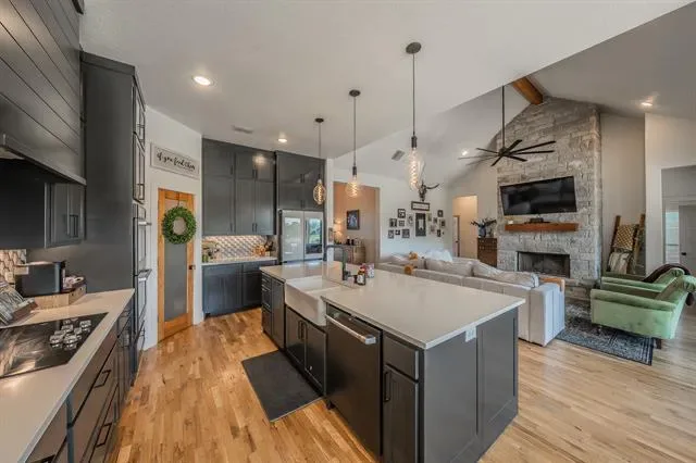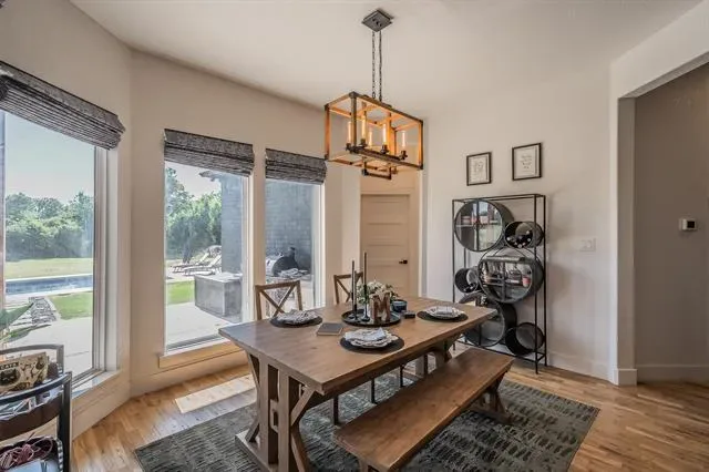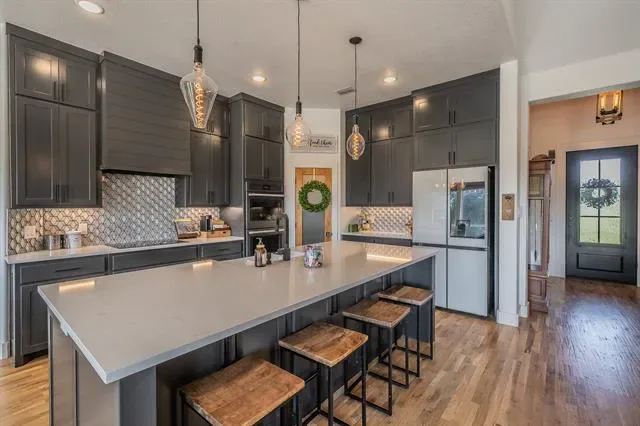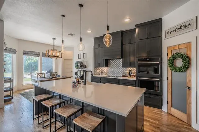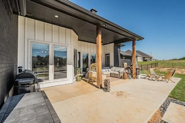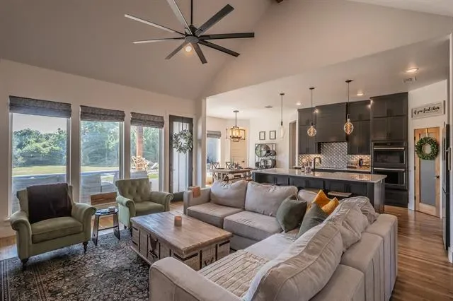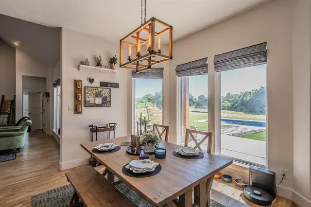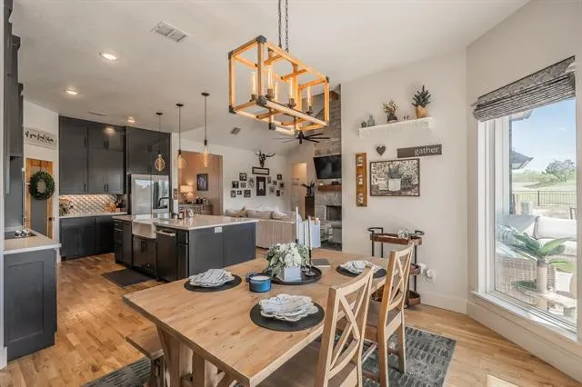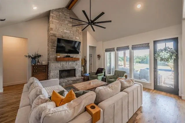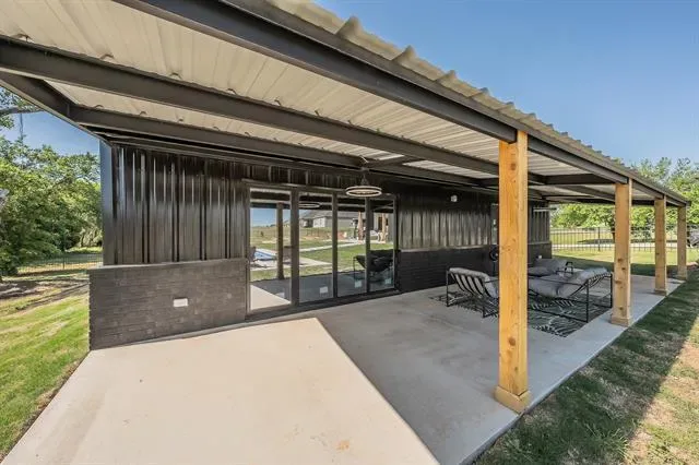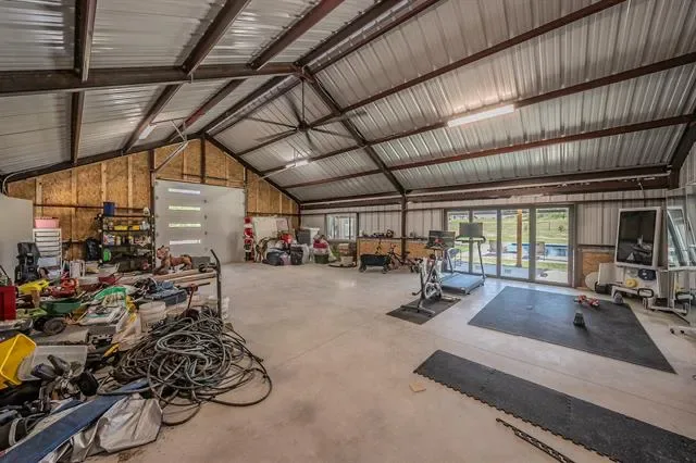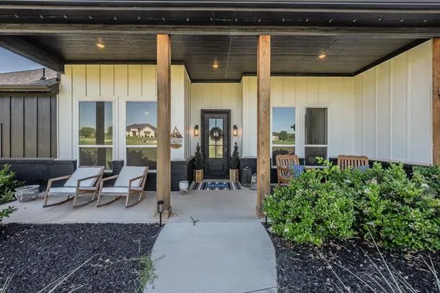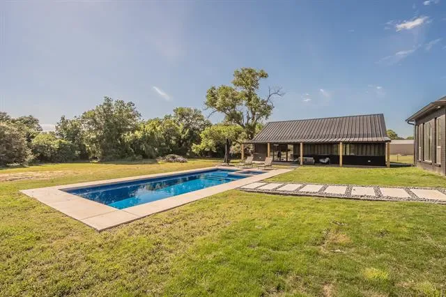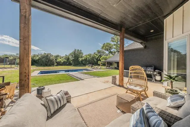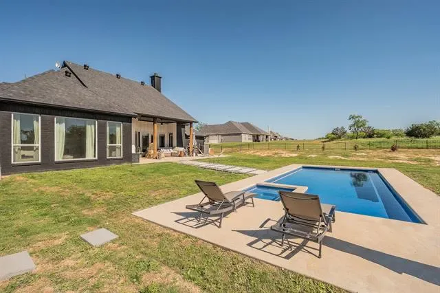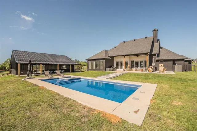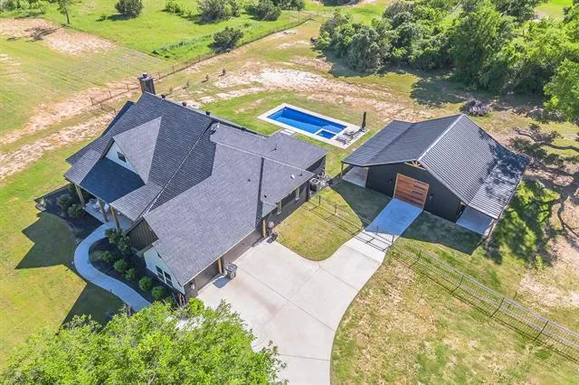 Nestled at the end of a cul-de-sac on a private 2 acre lot, this stunning home offers the rare combination of luxurious living and peaceful Texas country charm — all just minutes from the conveniences of Weatherford. Built in 2021, this beautifully designed 4-bed, 3-bath residence features an open-concept floorplan with soaring ceilings and natural light throughout. Hand-scraped natural oak hardwood floors add warmth and character to every room, while a striking stone fireplace anchors the main living area. The kitchen flows seamlessly into the main living space, making it ideal for gathering with family or hosting guests, and comes complete with a double oven, upgraded countertops, a stunning backsplash and premium faucets and fixtures throughout the home. In addition to four spacious bedrooms, the home includes a dedicated office &' a private workout room. Custom-built window shades add a polished finishing touch, and covered patios on both sides of the home create the perfect setting for morning coffee or evening entertaining. Step outside and discover a true backyard retreat. A sparkling pool, added in 2023, is thoughtfully positioned with easy access to a bathroom for effortless indoor-outdoor living. The exterior brick was freshly stained in 2025, giving the home a crisp, updated look. A true standout is the massive 1,200-square-foot shop built in 2025, complete with electricity and plumbing — ideal as a workshop, hobby space, or easily converted into a guest house or pool house. An additional 250 square feet of attic storage offers plenty of room for everything else. A three-car garage plus an extended driveway ensures ample parking for vehicles, trailers, or visiting guests. The fully fenced property provides room for pets, recreation, or simply breathing space that is hard to find this close to Weatherford conveniences. Enjoy wide-open skies, brilliant stargazing at night, and the kind of tranquility and privacy only a setting like this can offer.