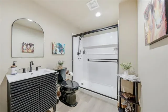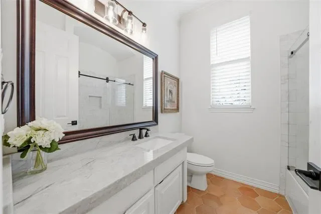 Inside, a formal dining area seamlessly connects to a spacious living room highlighted by a custom stone accent wall and a sleek electric fireplace. The seller has thoughtfully updated both the home and barn, including fresh interior paint, new lighting throughout, updated quartzite countertops, spray-foam insulation in the barn, as well as so much more for enhanced efficiency and comfort. The private primary suite offers a true retreat, complete with a spa-inspired soaking tub, a glass-enclosed shower, and a generous walk-in closet.