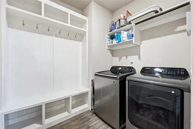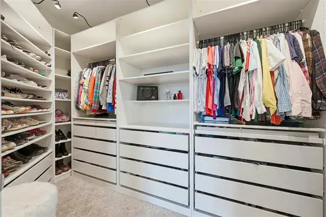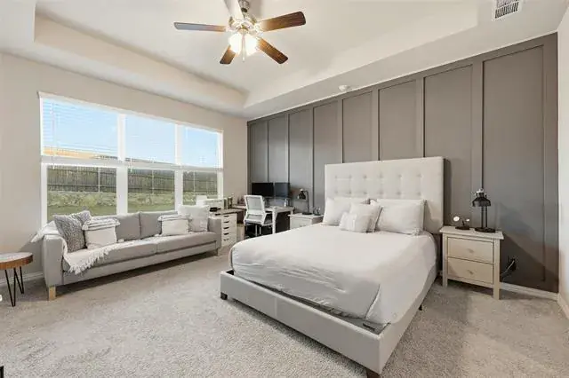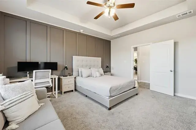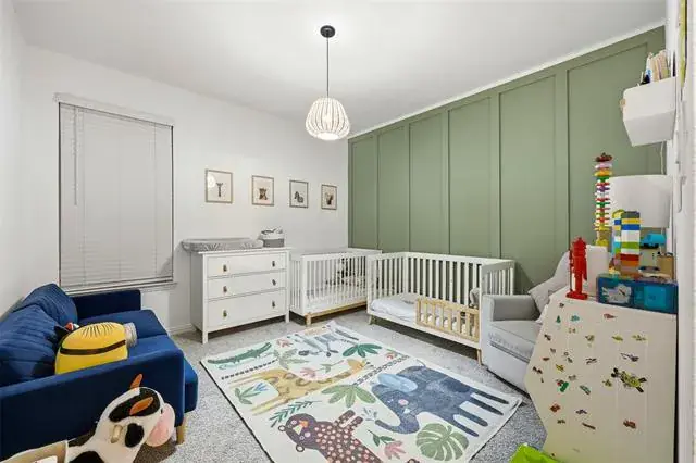 Two secondary bedrooms and a full bath are conveniently located off the dining area, while the private owner’s suite is tucked away for added privacy, featuring double-door bath entry and a custom closet. Wood-slat accent walls and custom paint add warmth and character throughout the home.