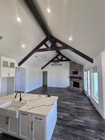 The heart of the home is an expansive open-concept great room, anchored by a towering brick wood-burning fireplace and rustic exposed beams. Walls of windows flood the space with natural light, controlled effortlessly by custom motorized shades. The chef-inspired kitchen features premium finishes, ample storage, and seamless flow for entertaining.