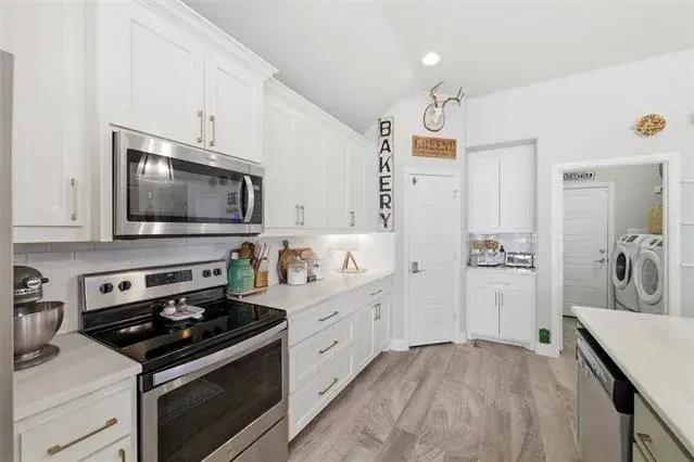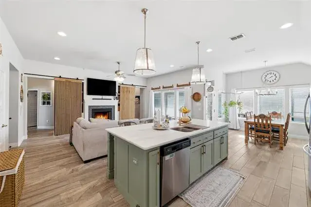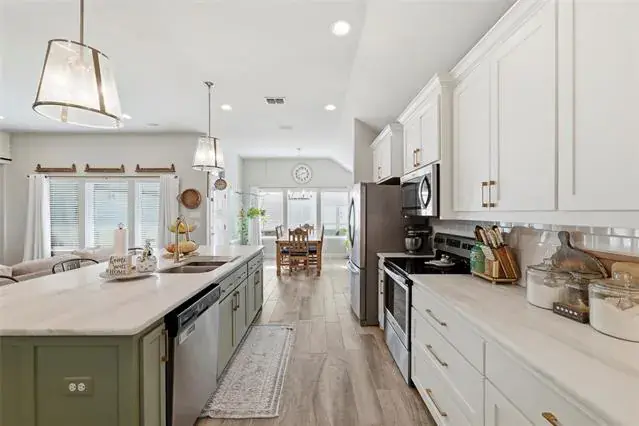 Decorative Lighting, Eat-in Kitchen, Kitchen Island, Open Floorplan, Vaulted Ceiling(s), Walk- In Closet(s)