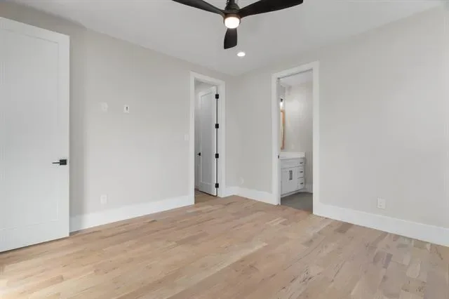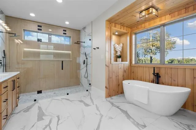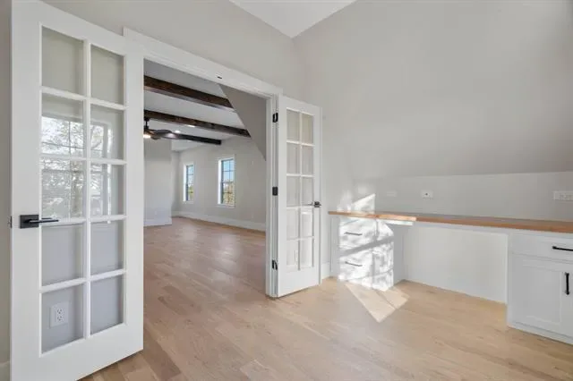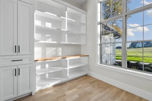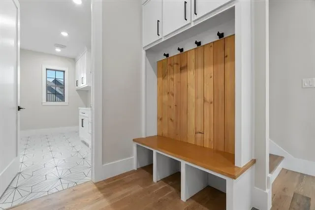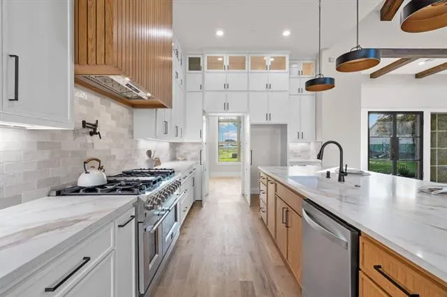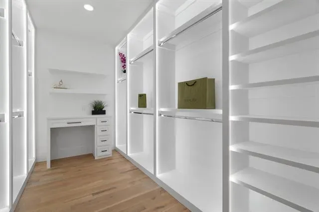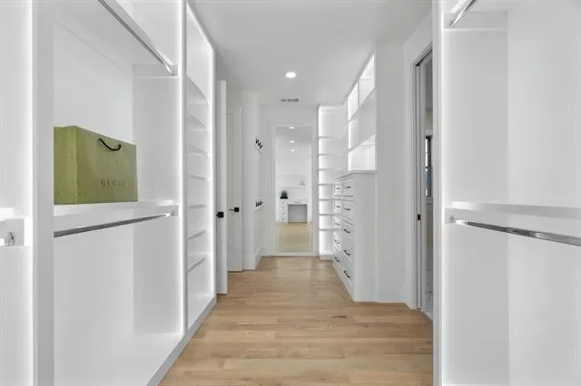 inch white oak wood floors and designer tile throughout, custom trim and built-in cabinetry, and beautiful beams in both the living room and primary suite. The gourmet kitchen shines with sleek quartz countertops, a large walk-in pantry, and a seamless flow into the main living area — perfect for entertaining. The primary suite offers a spa-inspired bathroom, a custom walk-in closet with built-ins and lighting, and a direct connection to the laundry room for convenience. Each secondary bedroom includes walk-in closets, with one ensuite and a Jack-and-Jill bath for the others.