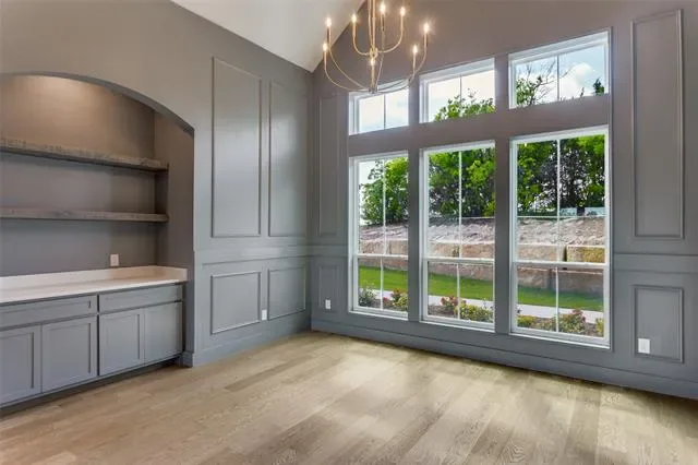 Chandelier, Decorative Lighting, Kitchen Island, Open Floorplan, Pantry, Vaulted Ceiling(s), Wainscoting
