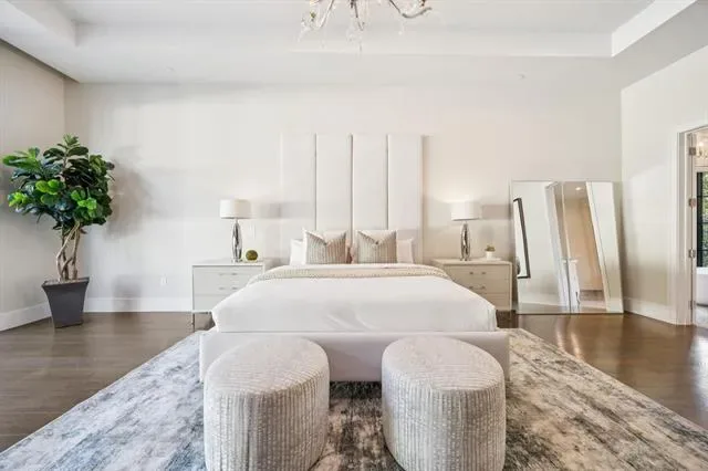 The opulent primary suite is a true haven, adorned with exquisite marble details, two custom-designed closets, and storm shelter.