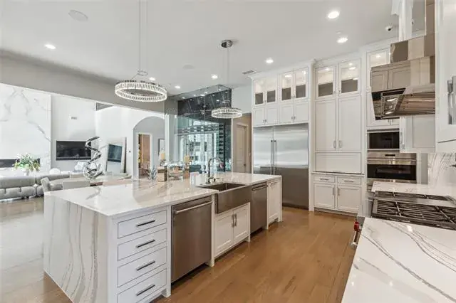 Prepare to be captivated by this Mediterranean-inspired masterpiece that seamlessly blends classic architecture w modern transitional elements, located in prestigious Quail Hollow. This 24 hour guard gated community is the most highly coveted neighborhood in Westlake. This luxurious 7,810 sq ft custom home boasts 5 bdrms, 5.2 baths, & a 5 car garage w porte-cochere. Step inside to discover a world of elegance, featuring pristine white marble flooring, European inspired cascading staircase, custom designer tile adorning walls & ceilings, & more! A temp-controlled wine wall w glass doors, book-matched marble feature wall w fireplace, & main floor media room are a glimpse of the exquisite details that await. The owner’s suite is a sanctuary of comfort & style,offering expansive windows overlooking a private backyard oasis, & a safe-storm room. Outside, unwind in your own paradise w a sparkling pool & spa, expansive covered patio w fireplace, outdoor kitchen, & putting green. This home is a testament to luxury living at its finest, where every detail has been meticulously crafted to create an unparalleled living experience. Westlake Academy and open enrollment to CISD!