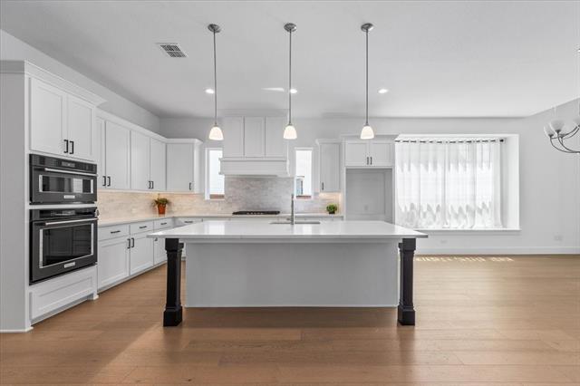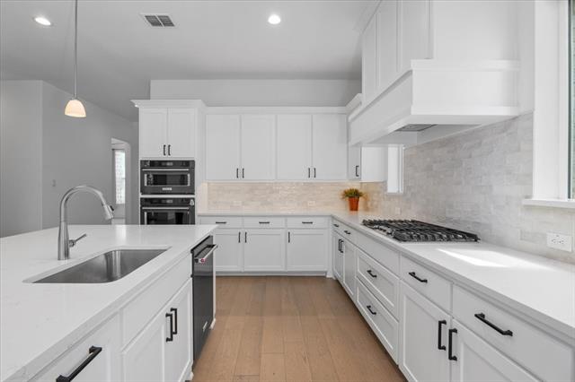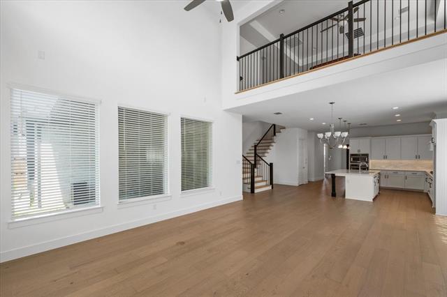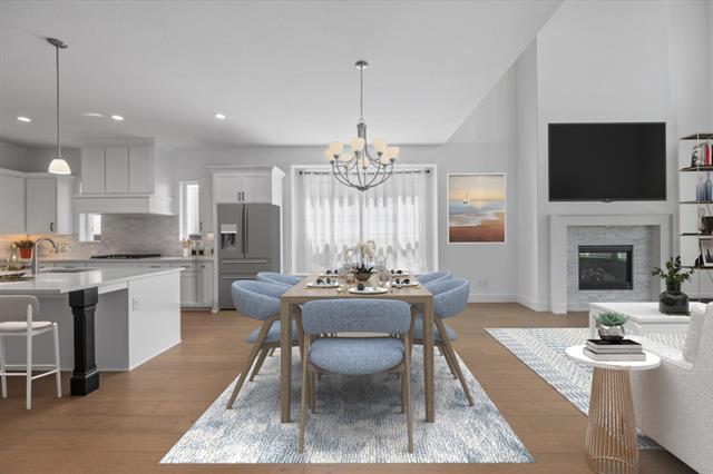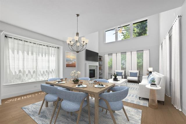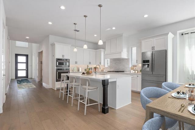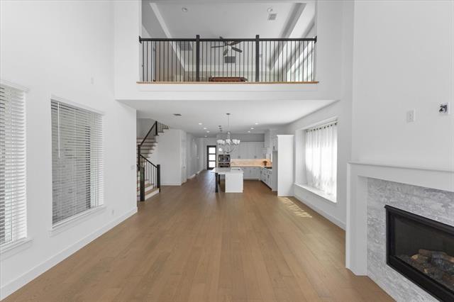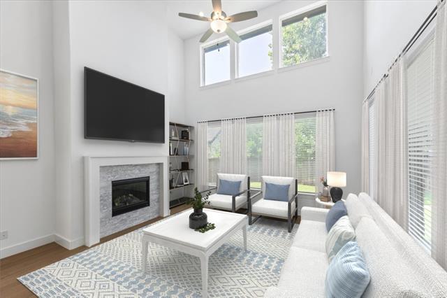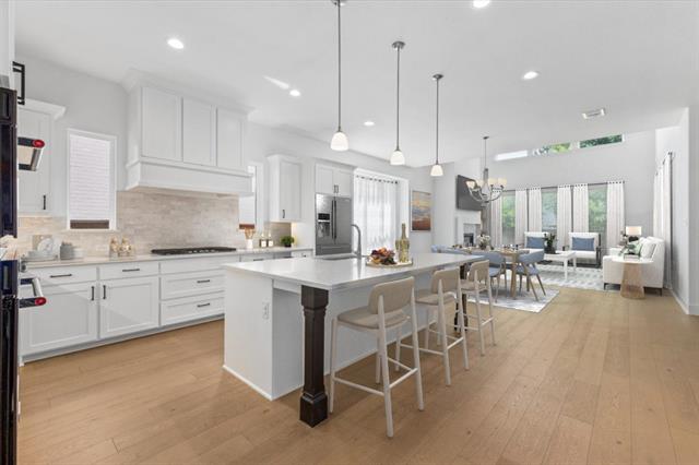 The home features a highly functional floor plan with five bedrooms, four full baths, a private office, media room, and an expansive upstairs game room. The open-concept main living area is filled with natural light and anchored by a chef’s kitchen with quartz countertops, upgraded built-in appliances, custom cabinetry, and a large island that flows seamlessly into the dining and living spaces. A gas-log fireplace and beautiful wood floors add character and comfort, while walls of windows overlook the covered patio and backyard.