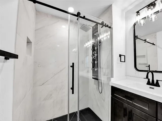 Primary Suite Oasis – Cathedral ceiling, luxurious ensuite bath with a high-end body jet shower, and a spacious walk-in closet