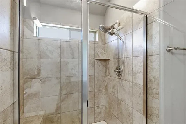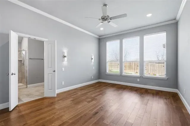 The primary suite offers crown molding, custom dimmable lighting, an extended walk-in shower, and a spacious walk-in closet with Elfa custom shelving. Secondary bedrooms also feature custom dimmable lighting and Elfa shelving systems.