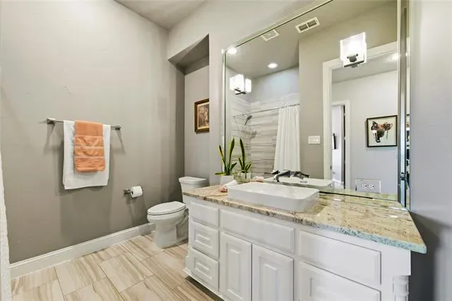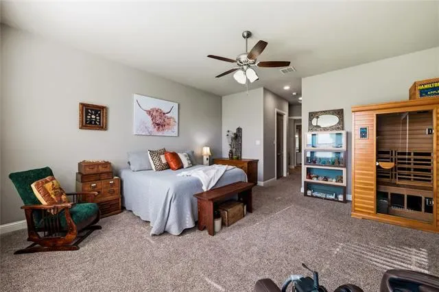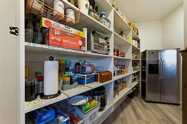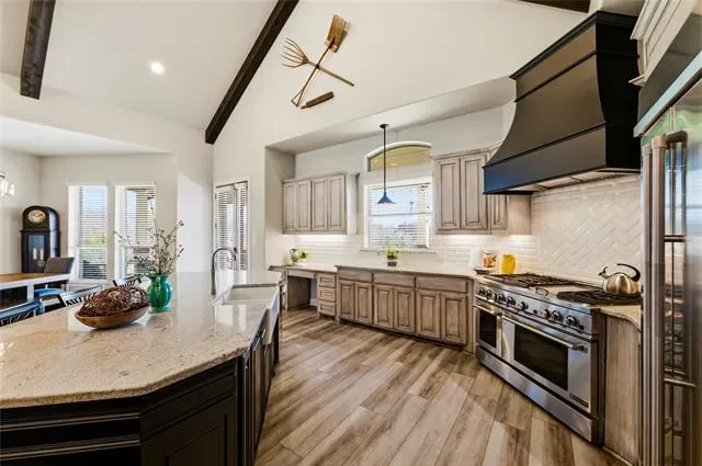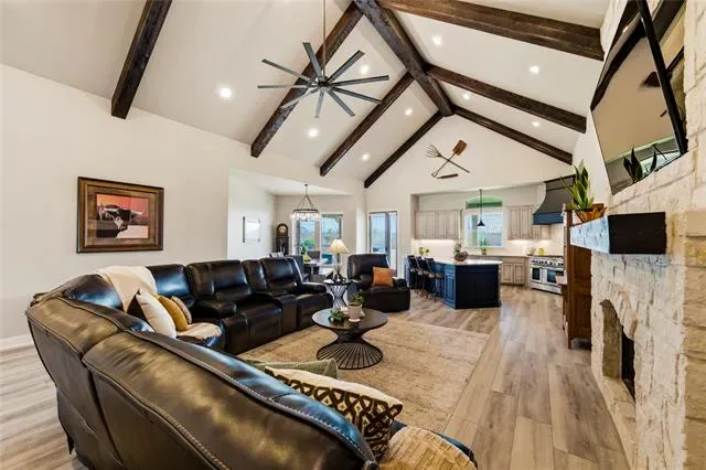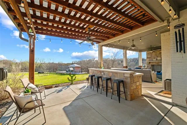Welcome to 110 Live Oak Court, a stunning custom-built one-story home located on a quiet cul-de-sac in Willow Park and included in Aledo ISD, offering the perfect balance of privacy, space, and convenience with highway access just one minute away. Built in 2017, this impressive 5-bedroom, 4-bath residence spans approximately 4,100 square feet and features an expansive open floor plan highlighted by soaring 20-foot vaulted ceilings with beautiful exposed beams that create a bright and inviting atmosphere. The home boasts exceptionally large bedrooms, with three of the five bedrooms offering private en suite baths for added comfort and convenience. The primary suite serves as a true retreat, complete with a massive walk-in closet featuring built-in dressers for ultimate organization. The spacious kitchen is designed for both functionality and entertaining and is complemented by a walk-in pantry equipped with a sink, space for a second refrigerator, and additional cabinetry for extra storage. The home also features a whole-home reverse osmosis water system and 54 solar panels for added efficiency. Step outside to an extended patio with a pergola, built-in grill, and outdoor propane fireplace, an ideal setting for relaxing or entertaining while enjoying the peaceful surroundings and abundant wildlife. Completing the property is a spacious 3-car garage, offering plenty of room for vehicles and storage. This beautifully designed home delivers luxury, functionality, and tranquility all in one exceptional location.