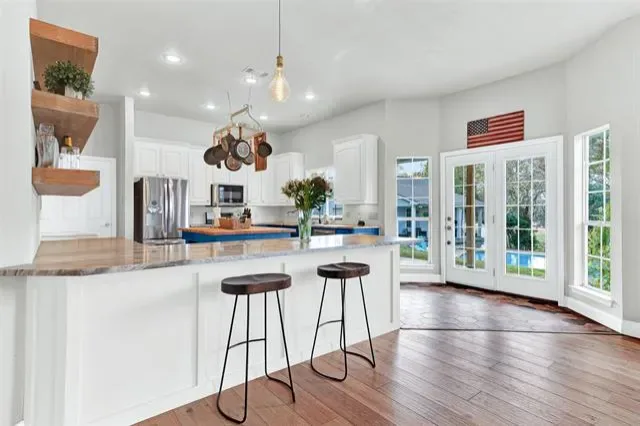 Tucked away on 4.5 private acres, 152 Valley View Court offers a rare blend of modern luxury and peaceful country living — just minutes from Fort Worth. This recently renovated estate sits at the end of a quiet cul-de-sac surrounded by mature trees and wide-open space, creating the perfect retreat from city life. Step inside to discover light-filled interiors featuring new flooring, fresh paint, a fully updated kitchen with sleek finishes, and elegant touches throughout. French doors open to a private office with a hidden safe room cleverly concealed behind custom built-ins — a truly distinctive feature.