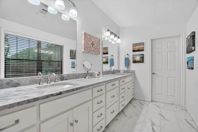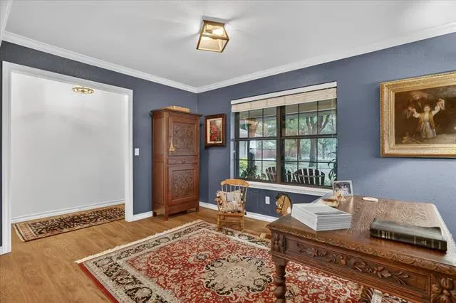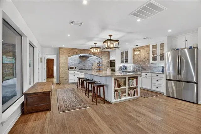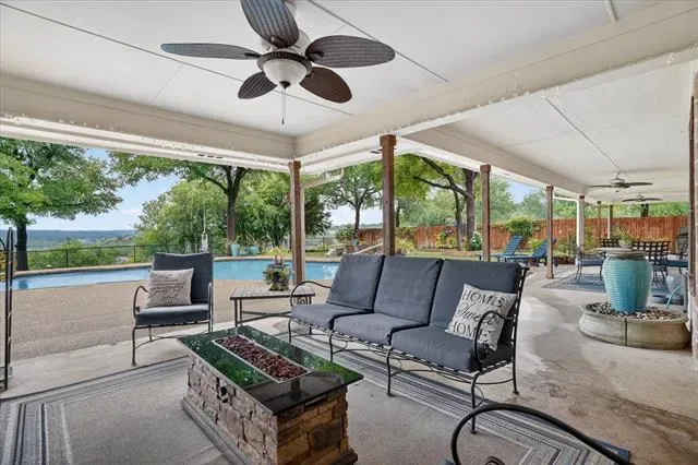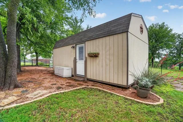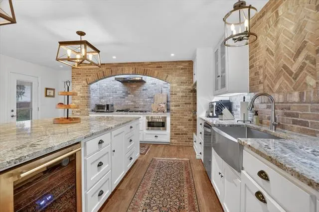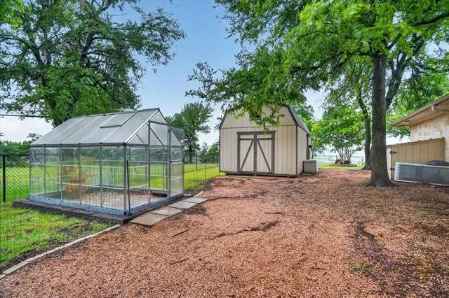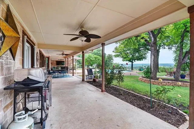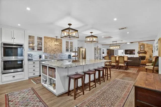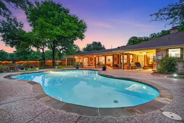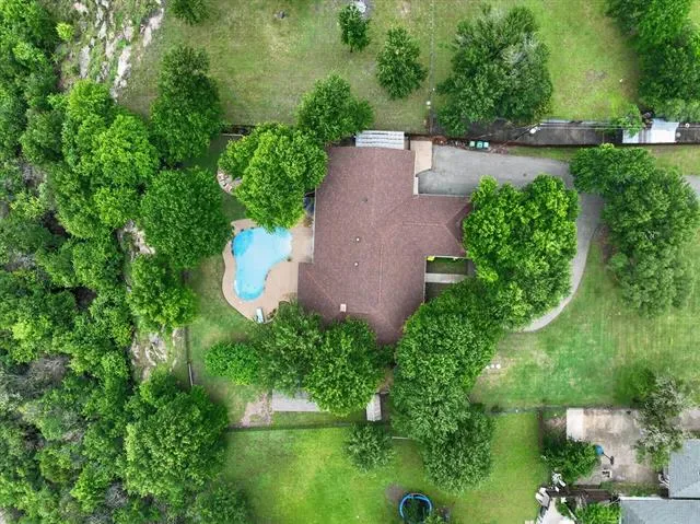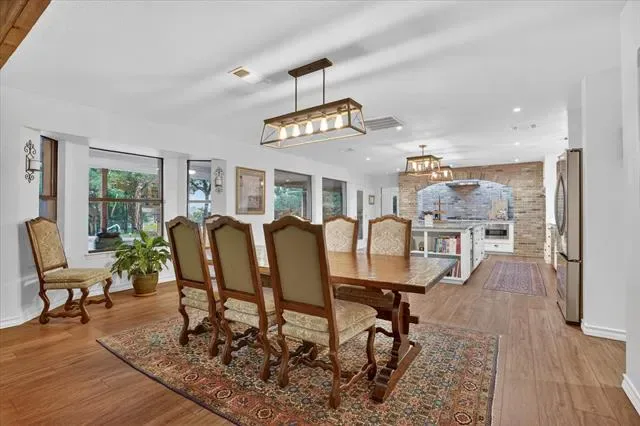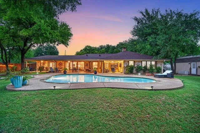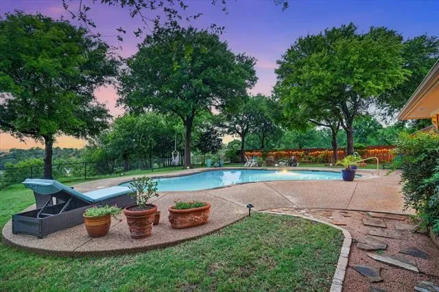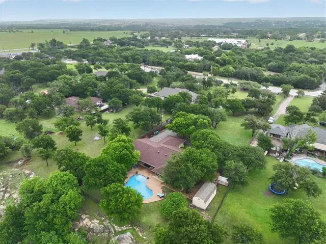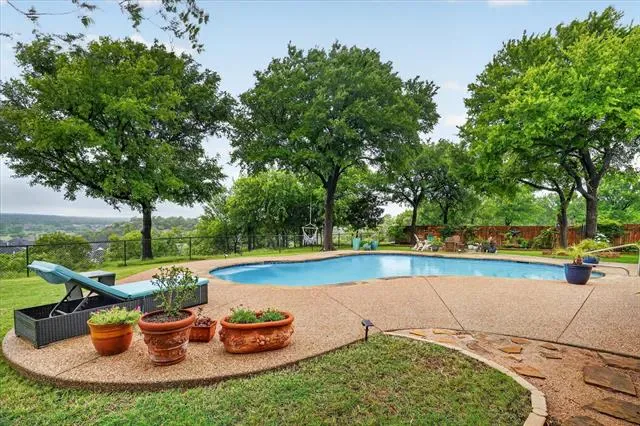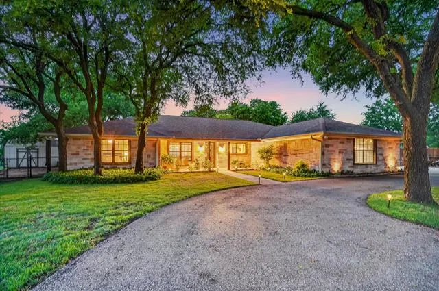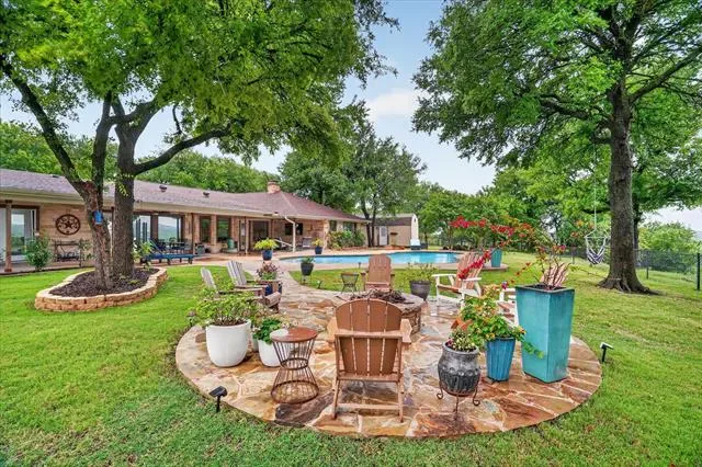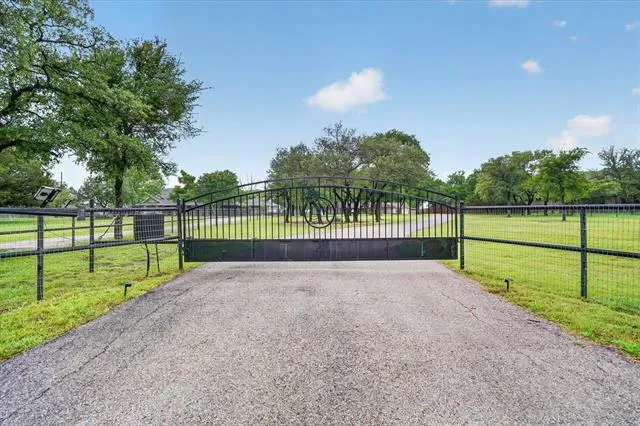Perched on a bluff with views that genuinely stop you mid-sentence, this home impresses all who enter through its private gated entrance. The love and attention poured into this 1.79 acre property makes it one we rarely see on the market. The iron gate sets the tone before you ever reach the front door. Pull through and the land opens up around you, mature oaks framing the drive, green, manicured space. Inside, vaulted ceilings with exposed wood beams anchor a living room that breathes. A floor-to-ceiling limestone fireplace with a reclaimed wood mantel, while a wall of windows pulls your eyes straight through to the pool and the valley beyond. The space flows seamlessly from living to dining to kitchen. Open and warm. Kitchen was built with a chef in mind, with full views of guests and the west valley. Exposed brick arches frame the range, granite counters run the length of the space, a farmhouse sink, and brass pendants elegantly hang. A separate butler’s pantry with additional granite counters and white cabinetry gives you the prep and storage space most dream about. Primary bath renovation speaks the loudest. A floor-to-ceiling glass-enclosed shower in marble tile with a built-in bench and brushed bronze fixtures. A double vanity stretching the full wall, marble counters, and marble floors. This is not a flip bathroom. Impeccable decisions here. This 3 bedroom home actually has 2 primary bedrooms. The second large bedroom can be that MIL suite, or used to indulge that teenager in your life. Out back is where you’ll understand this property is one of one. The pool sits beneath mature oaks that open valley view, orange at dusk behind it. There’s room to lounge, room to entertain, and a stone path leading you through the yard like the whole property was designed to be explored slowly. The big stuff has been done and documented. New septic (2021), two new AC units (2021 &' 2022), new pool plaster and coping (2022). This one you won’t stop thinking about. Aledo ISD.